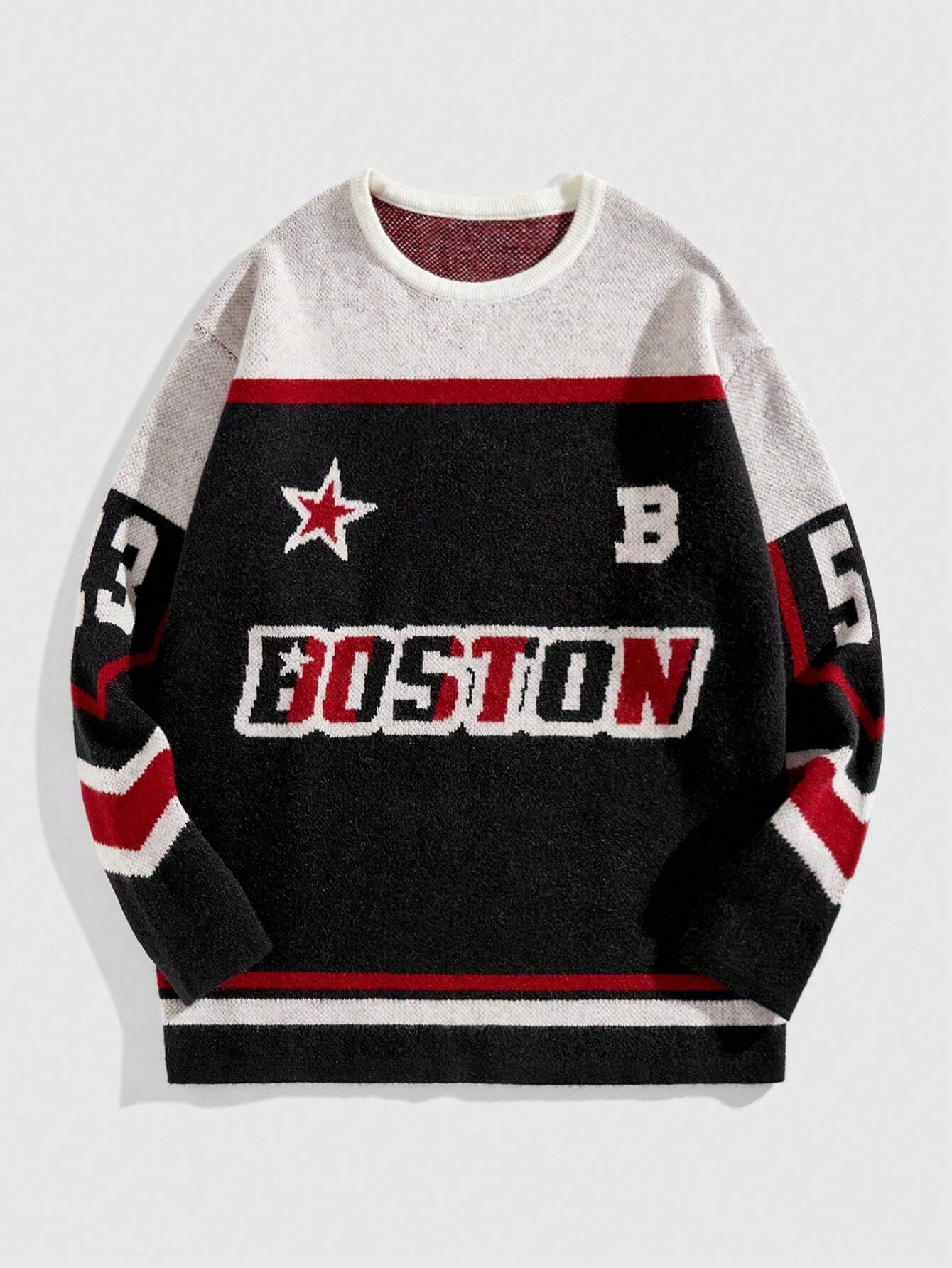 Prep pull tricoté à motif de lettre en blocage de couleurs décontracté pour hommes, automne/hiver