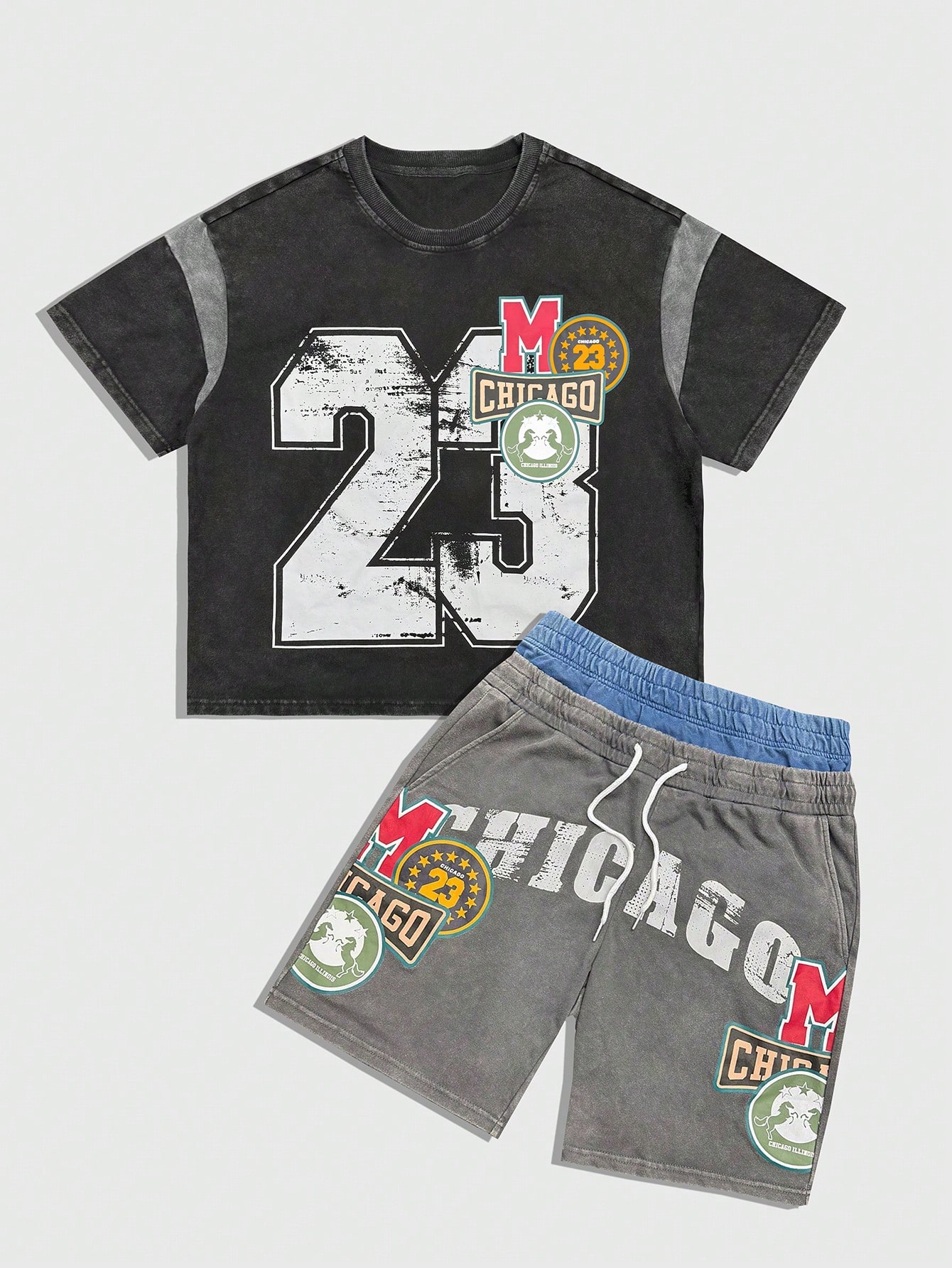Prep Ensemble t-shirt à manches courtes à imprimé numérique et lettre coloré, style décontracté de rue, et short à cordon de serrage 2 en 1, pour l'été, pour hommes