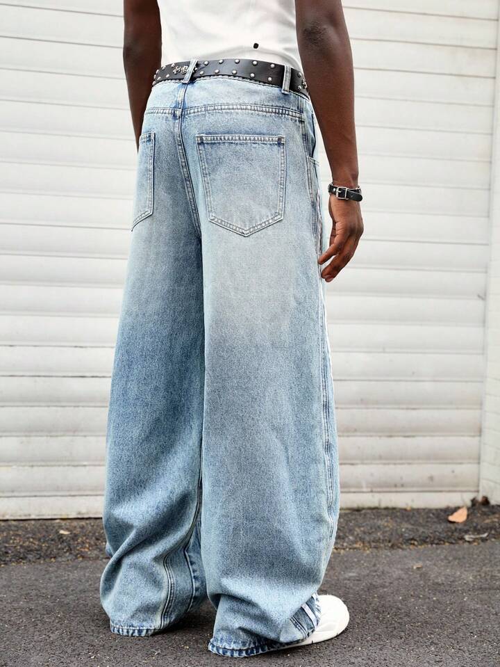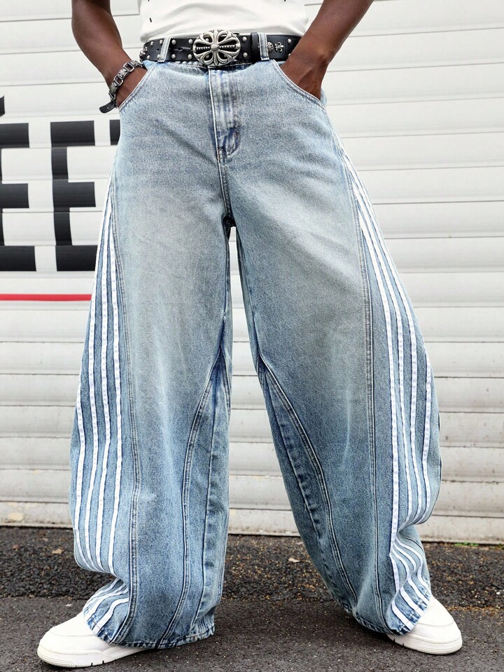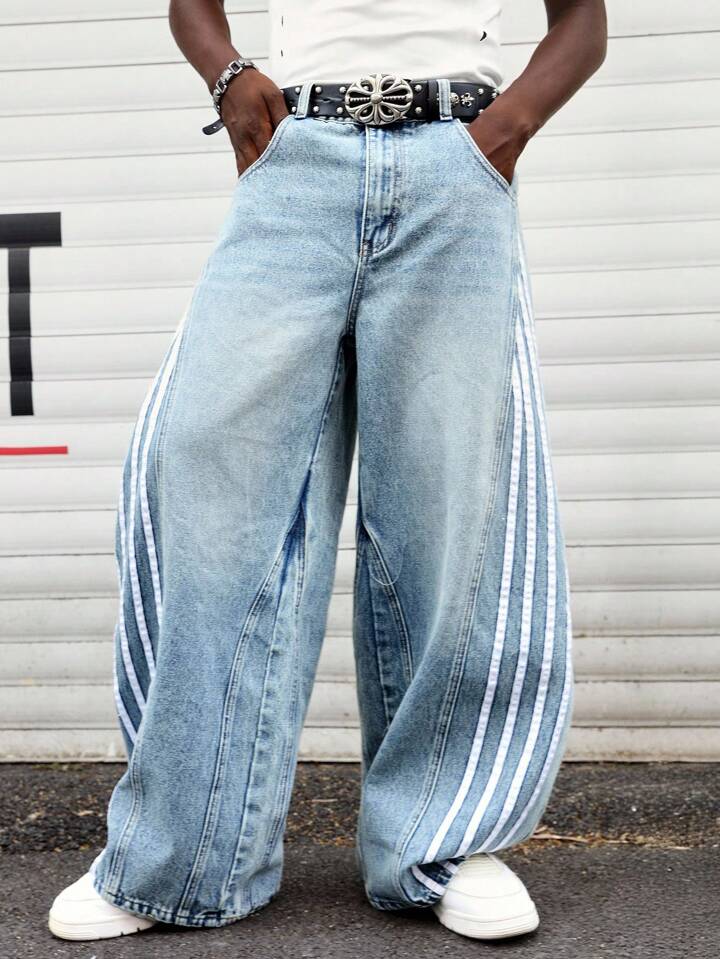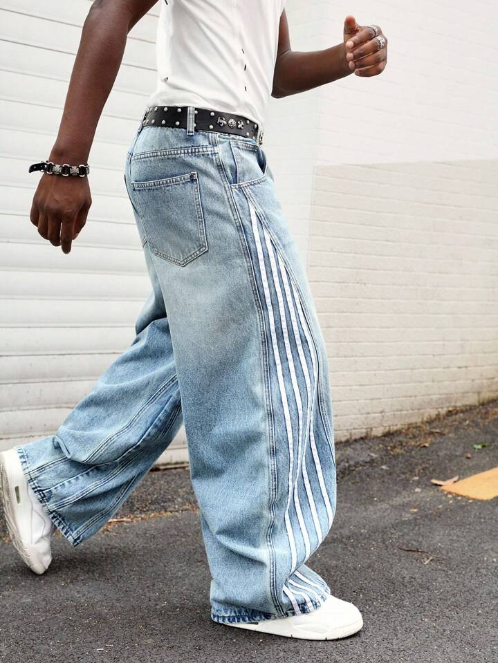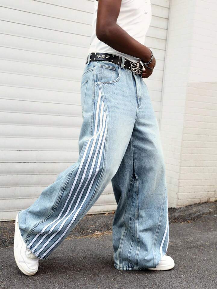 Prep Jeans décontractés coupe ample à jambes larges avec rayure latérale et poches pour hommes