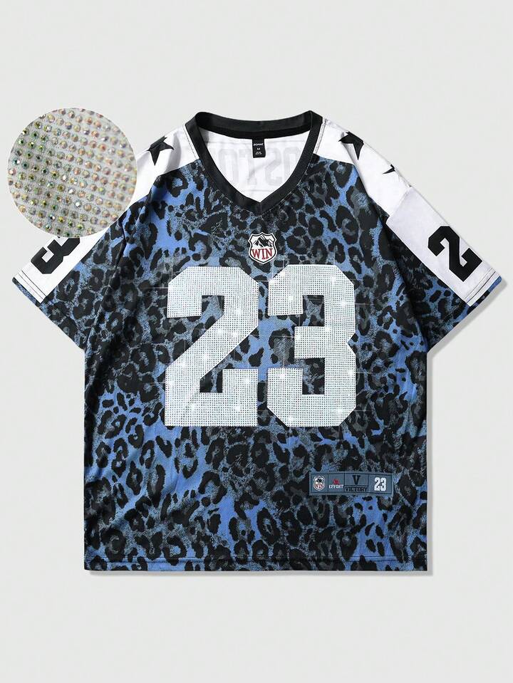 Prep T-shirt à manches courtes pour hommes, style urbain hip-hop avec imprimé vintage de slogan de nom de ville américaine sur fond de motif animal léopard. Convient pour le port quotidien au printemps/été