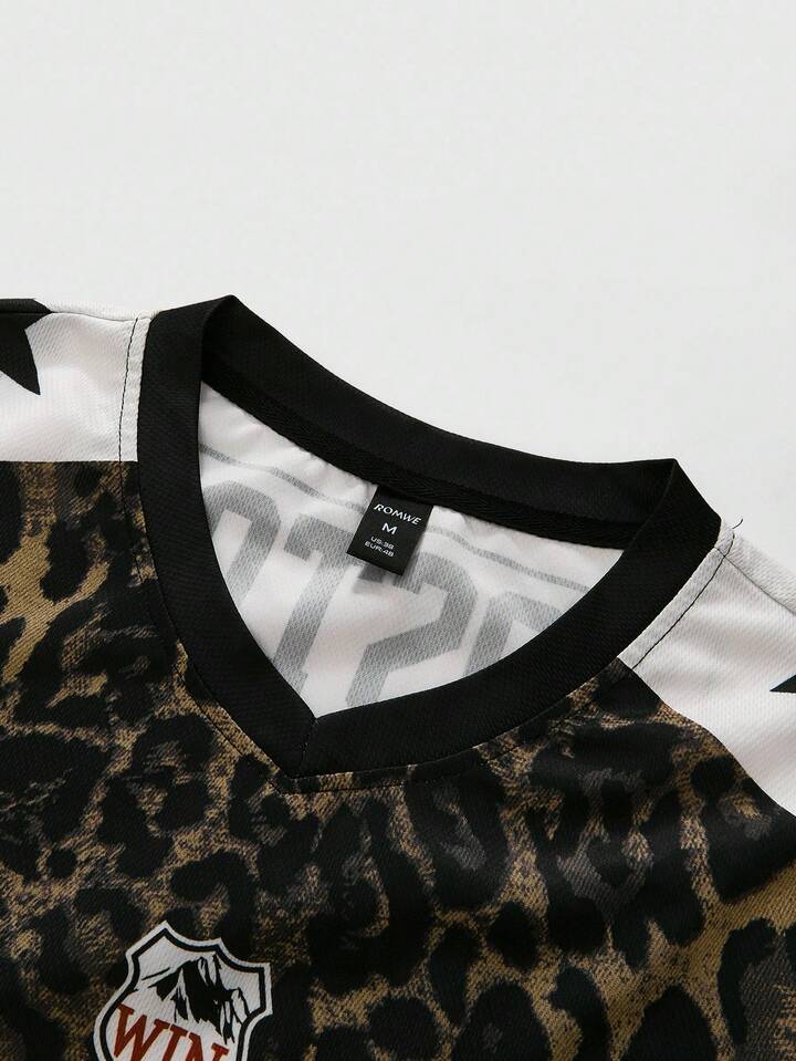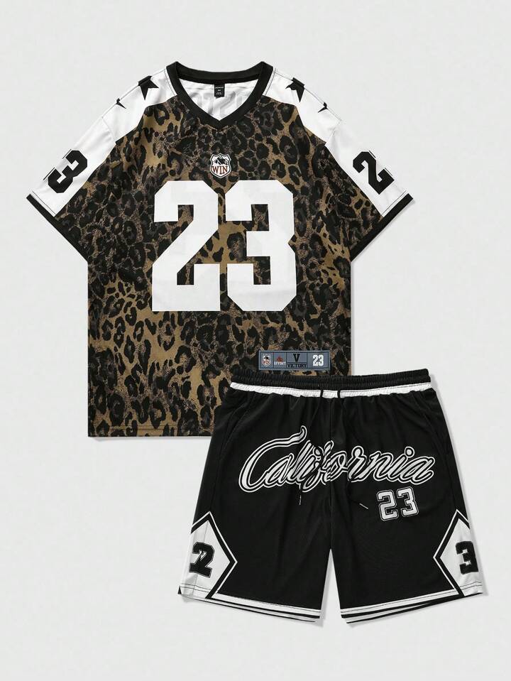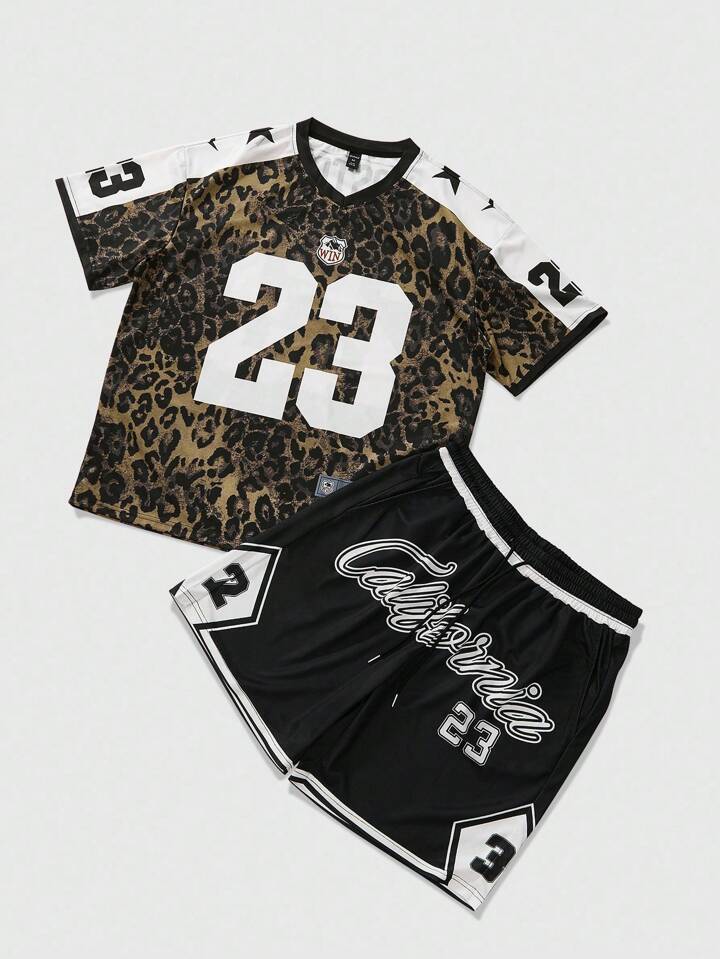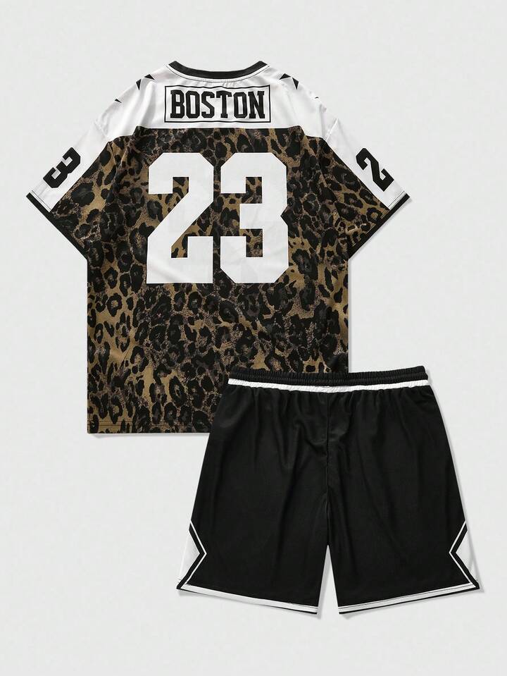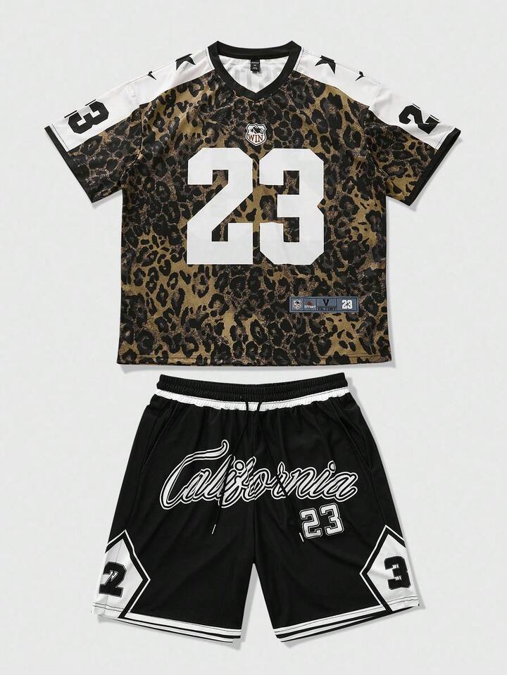 Prep Ensemble t-shirt à manches courtes et short casual d'été pour homme, en patchwork avec imprimé léopard et motif numérique