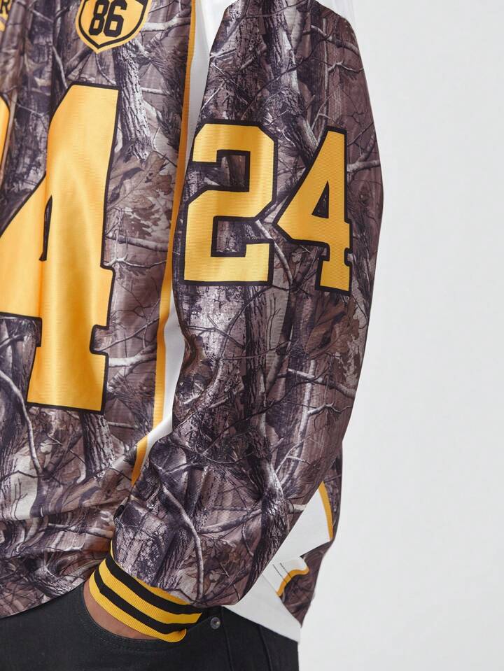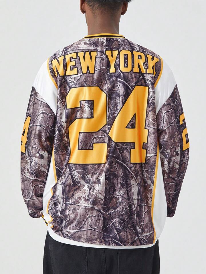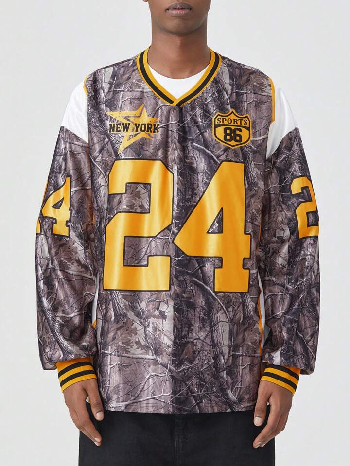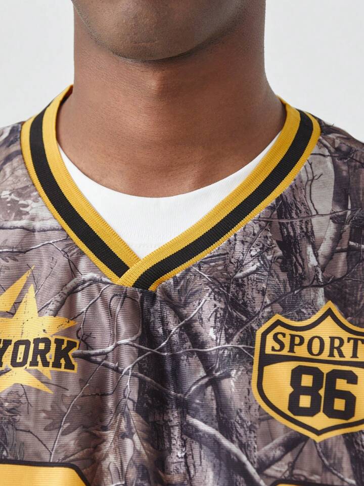 Prep T-shirt casual à manches longues et col en V pour hommes, imprimé lettres et branches d'arbre, automne
