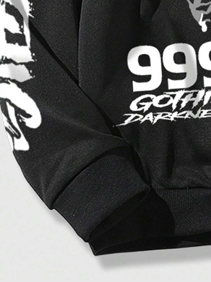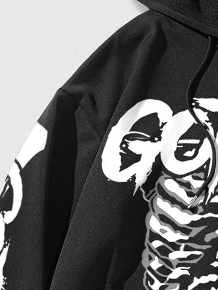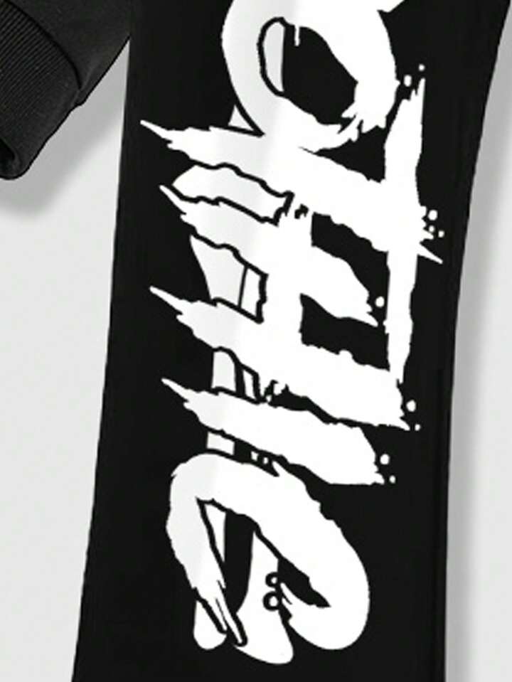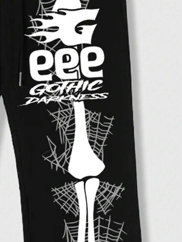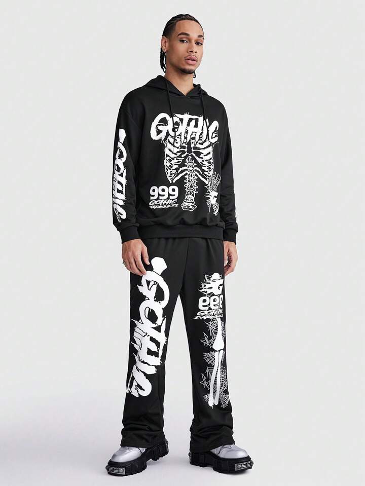 ROMWE Avant 2 pièces Ensemble de Sweat-shirt à capuche et pantalon de jogging imprimé crâne et lettres, décontracté pour homme, pour l'école