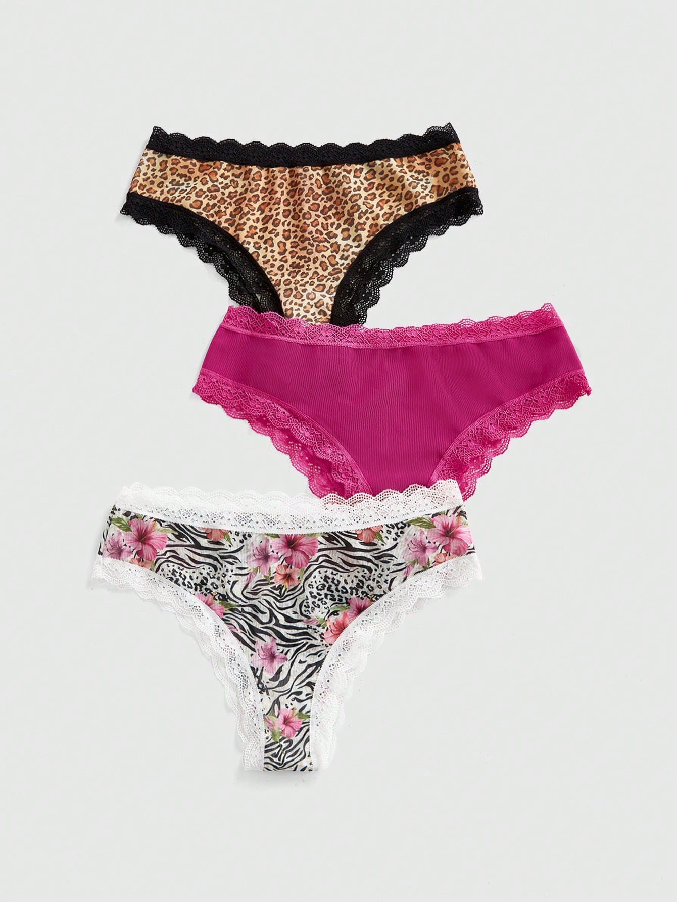 ROMWE Avant 3 pièces/Set de culottes pour femmes avec motifs d'île, de cowgirl, de zèbre, de léopard et d'hibiscus en patchwork de maille et de dentelle