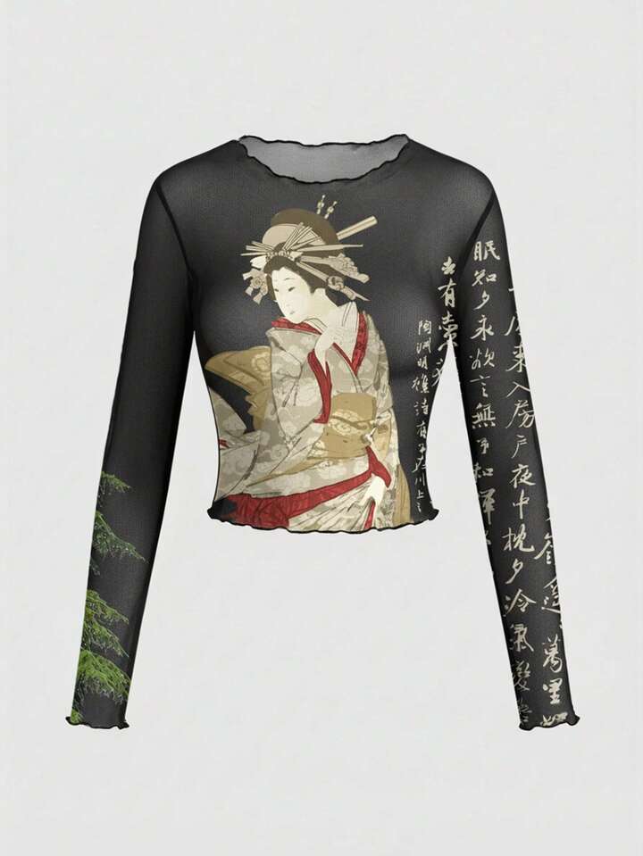 ROMWE Avant Blouse à manches longues en maille transparente avec calligraphie chinoise pour femmes