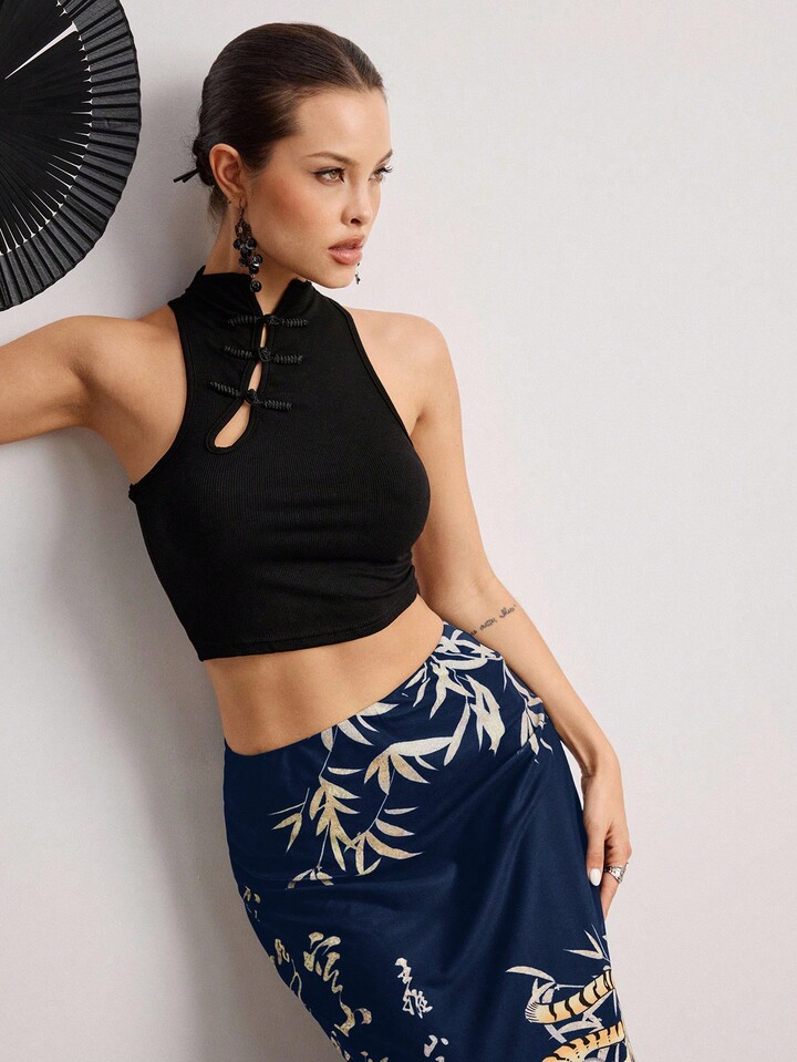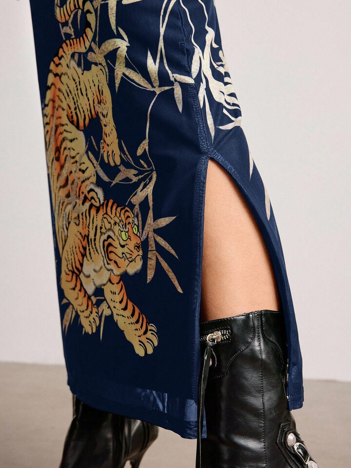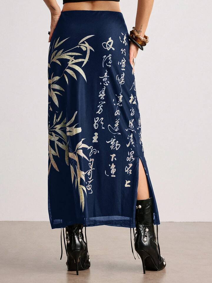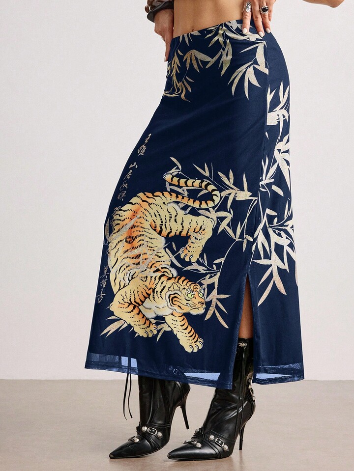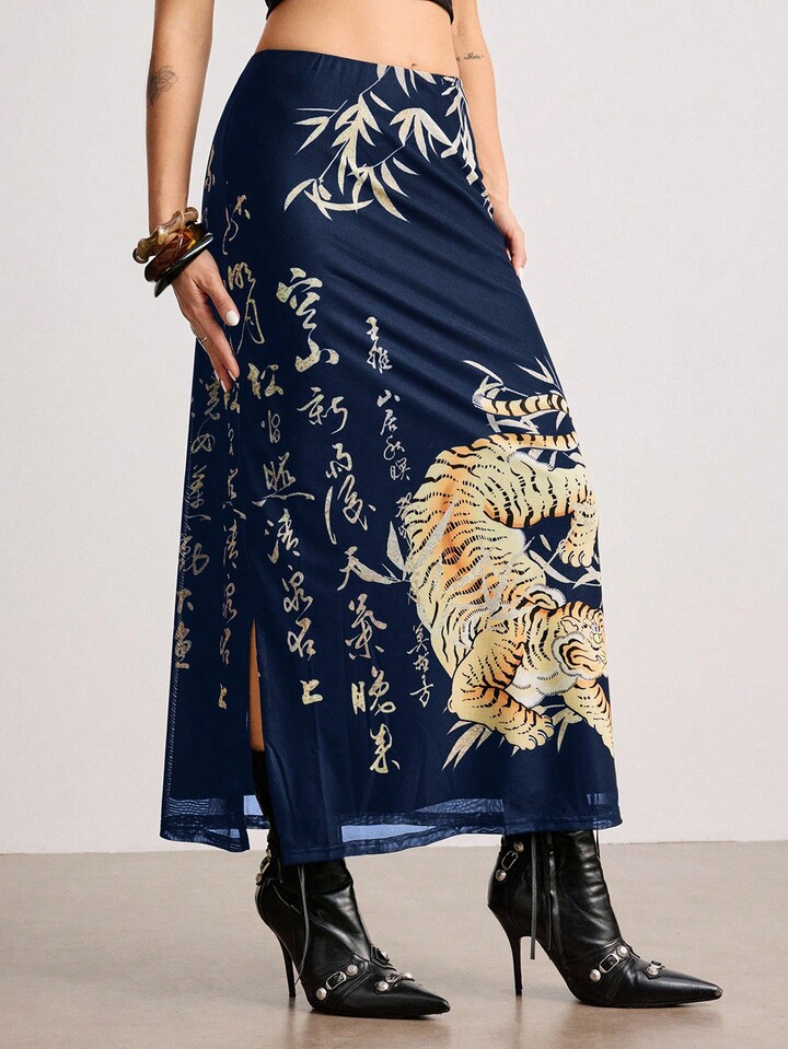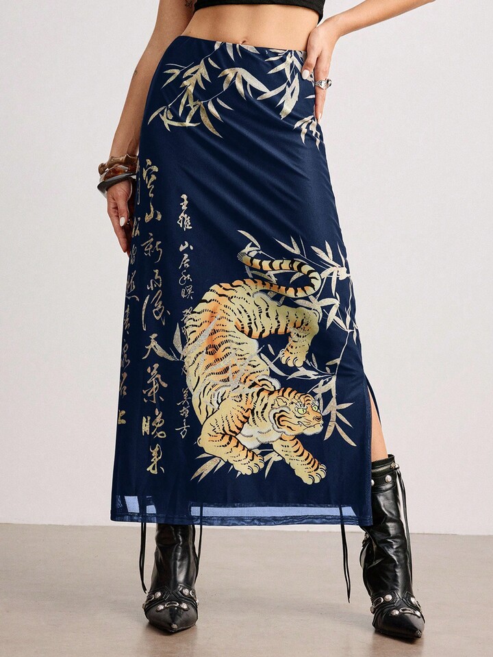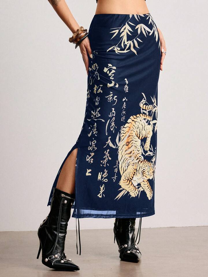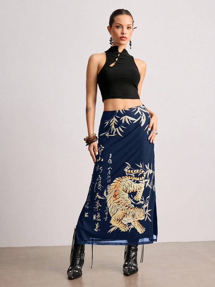 ROMWE Avant Jupe fendue pour femme avec imprimé calligraphique de tigre et de feuilles de bambou dans un style chinois