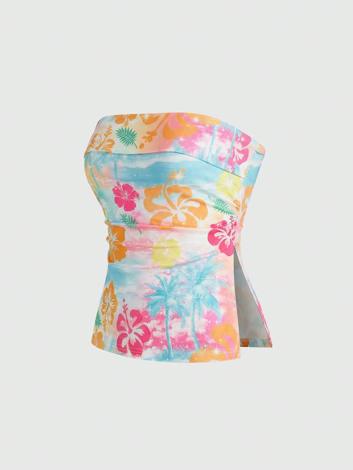 ROMWE Avant Top court tube à imprimé floral avec fente à l'ourlet style Y2K, style île de vacances