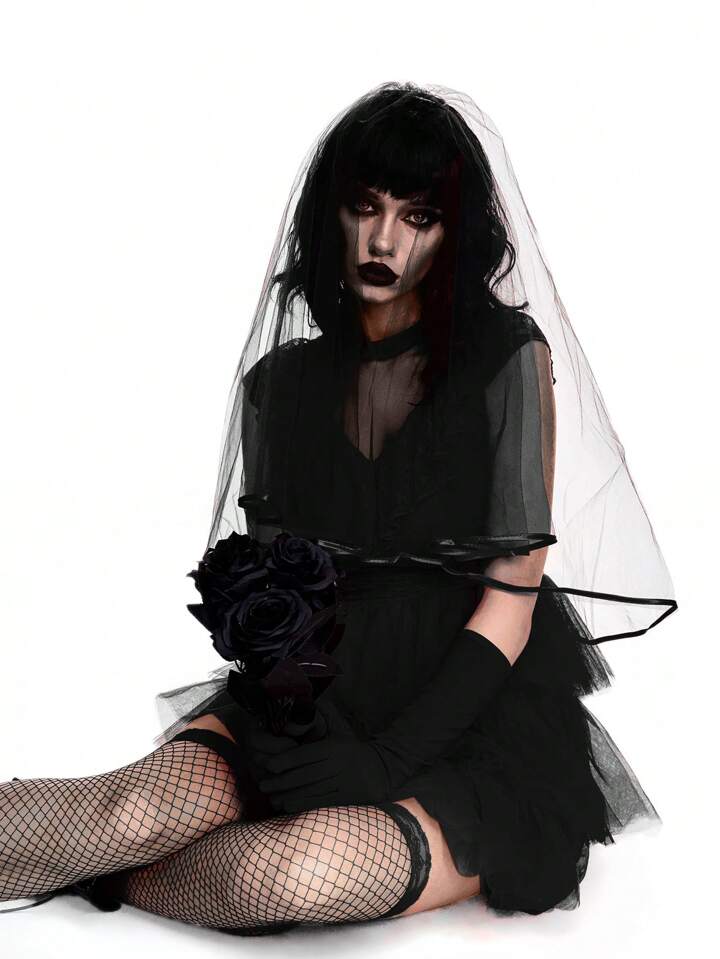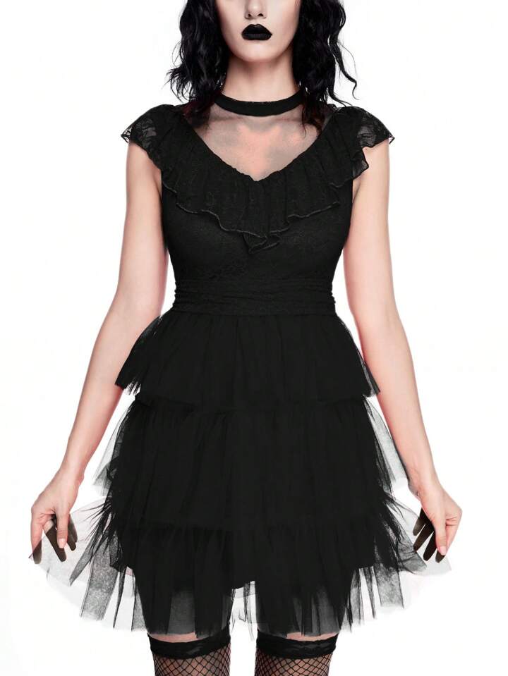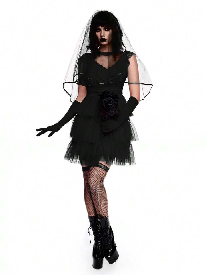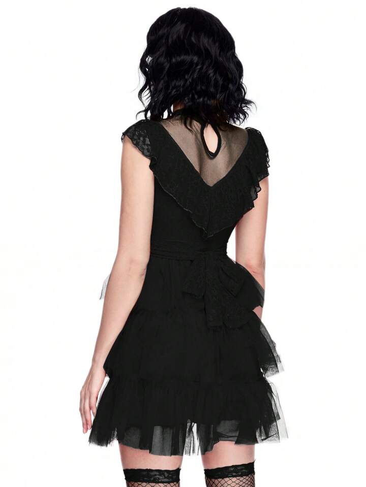ROMWE Avant Costume gothique, effrayant et mystérieux - Robe de mariée multicouche en dentelle et tulle avec nœud papillon, tenue de mariée cosplay, Halloween