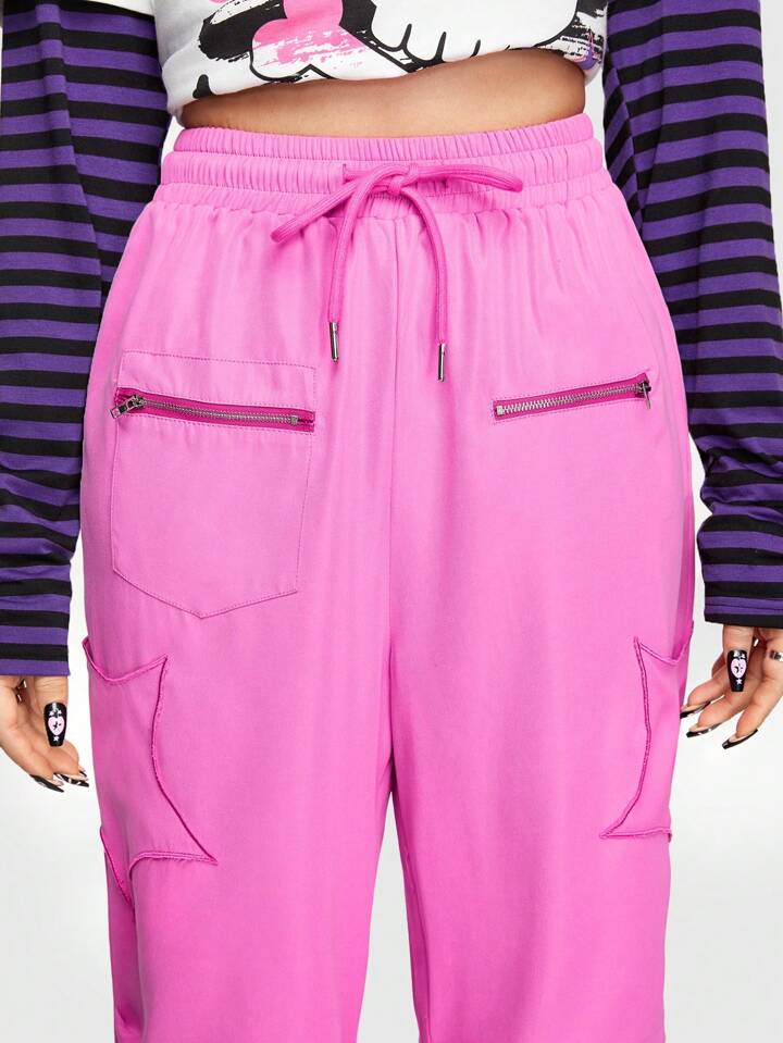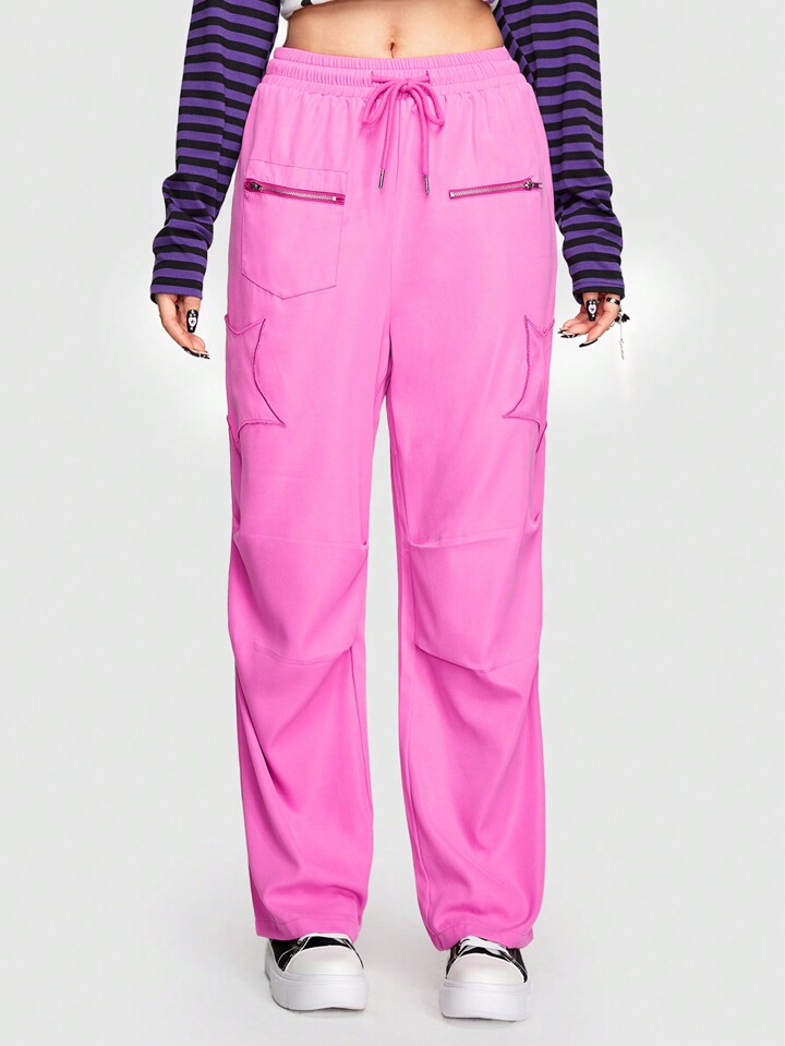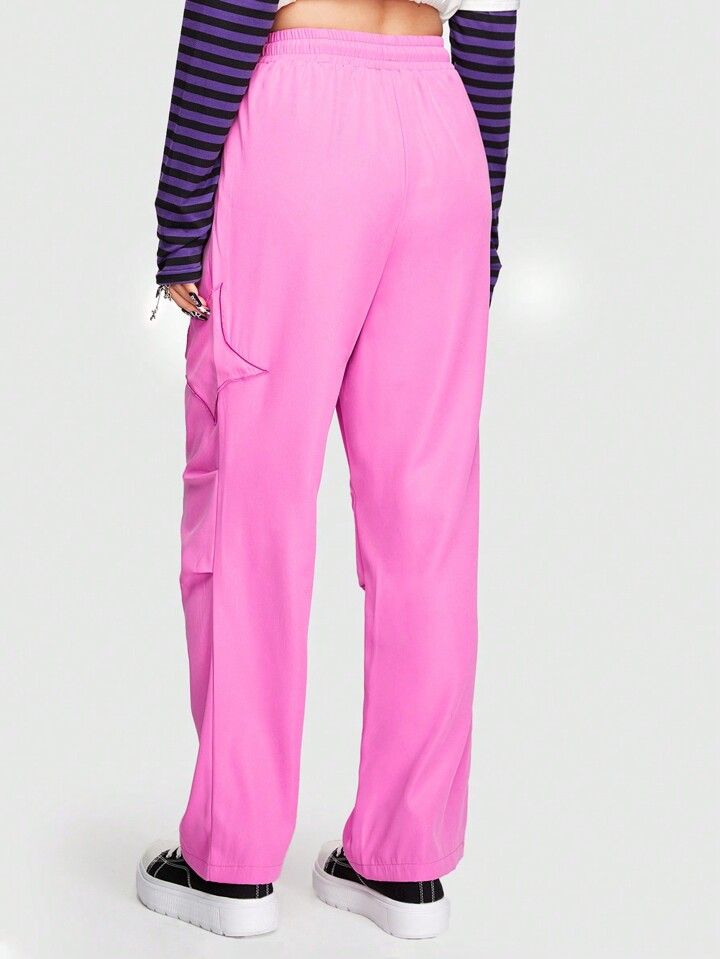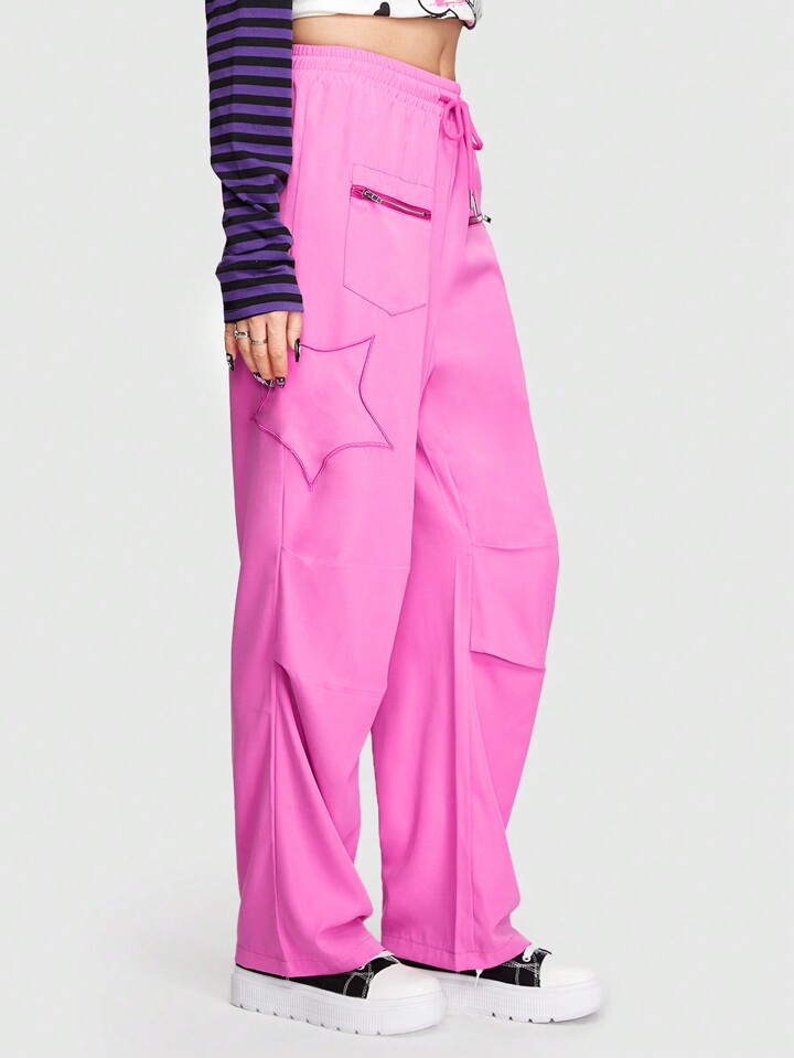 ROMWE Avant Pantalon Rose Coupe Ample À Jambe Droite Avec Patchs Étoiles, Taille Élastique Et Fermeture À Glissière