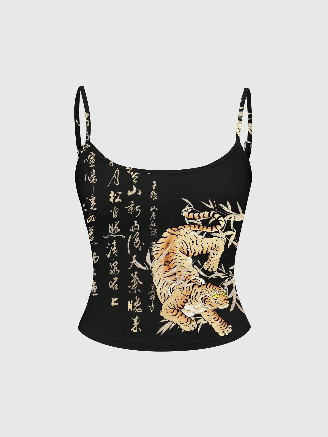 ROMWE Avant Débardeur style punk avec calligraphie chinoise et motif tigre, style de rue pour femmes