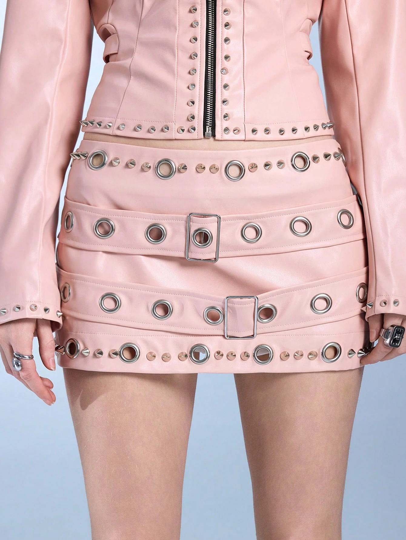 ROMWE Avant Jupe mini en PU à taille basse avec décoration de rivets, style rétro sexy et moulant