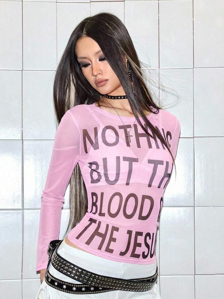 ROMWE Avant Blouse transparente avec imprimé lettres et croix