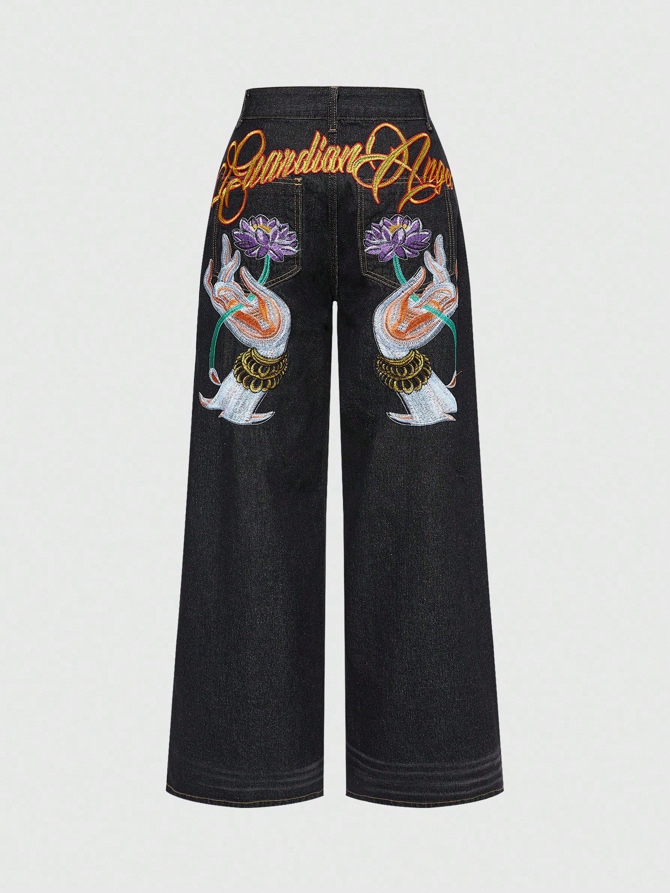 ROMWE Avant Jeans droits unisexes rétro Y2K style chinois de base avec broderie de lotus