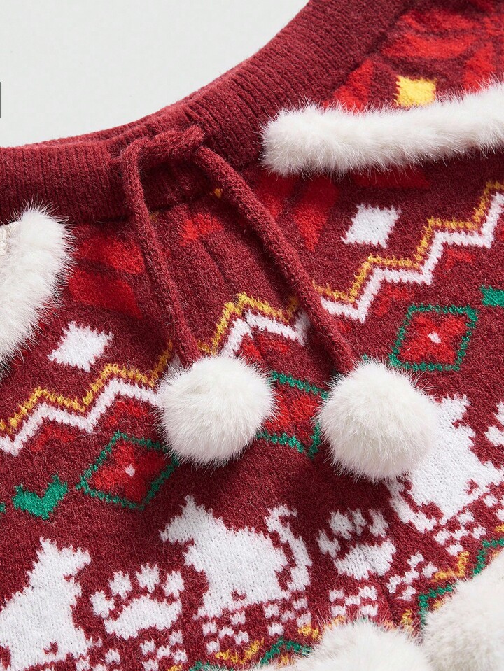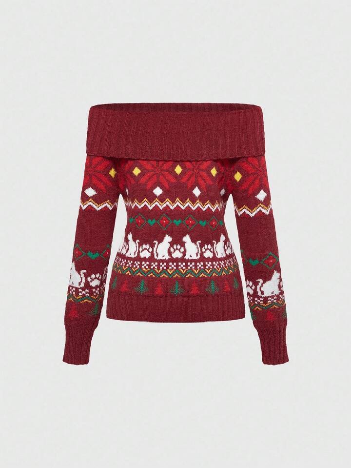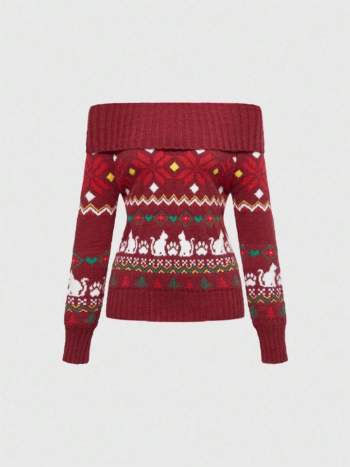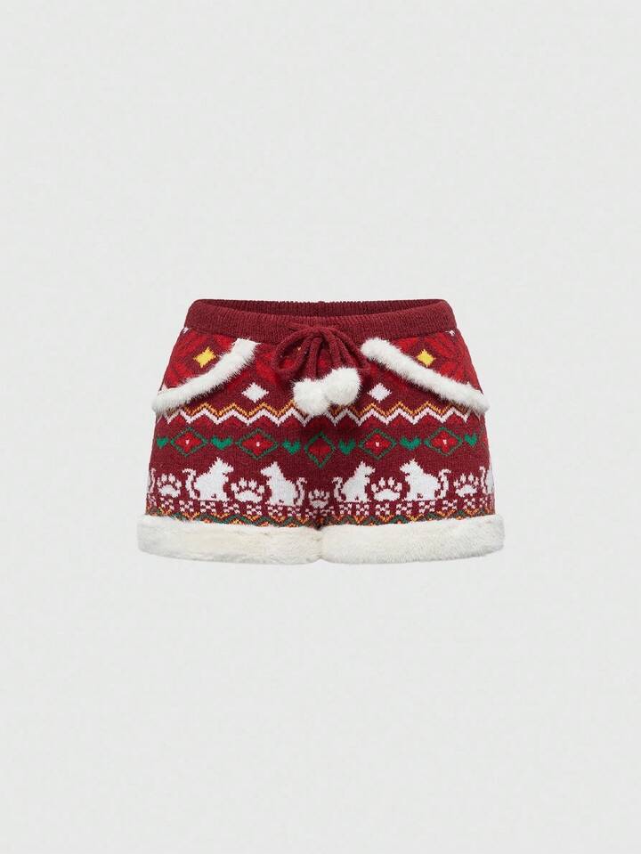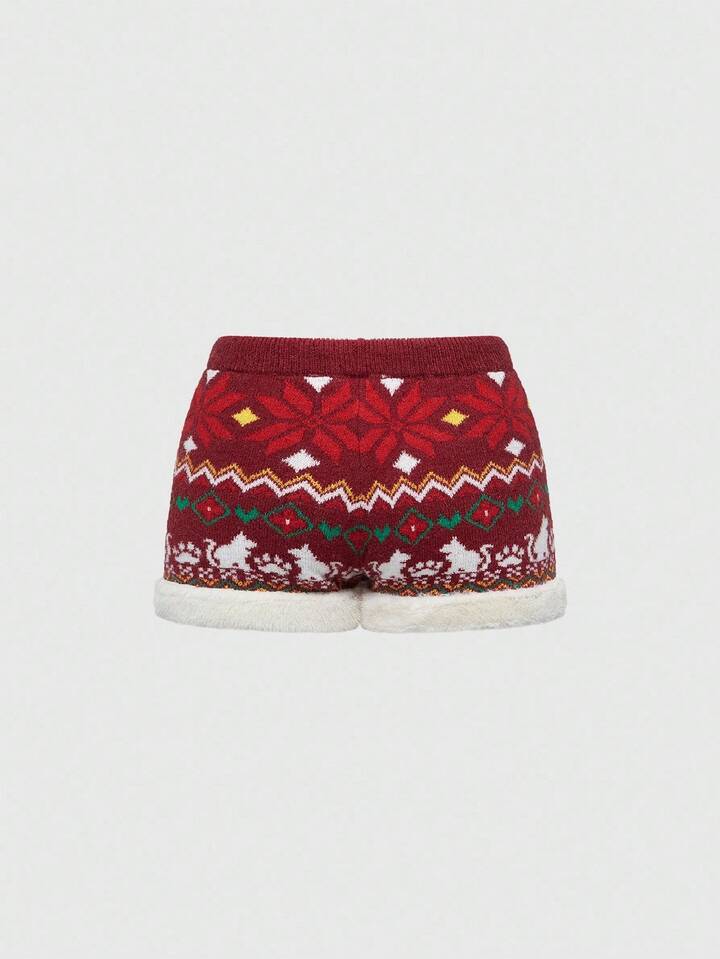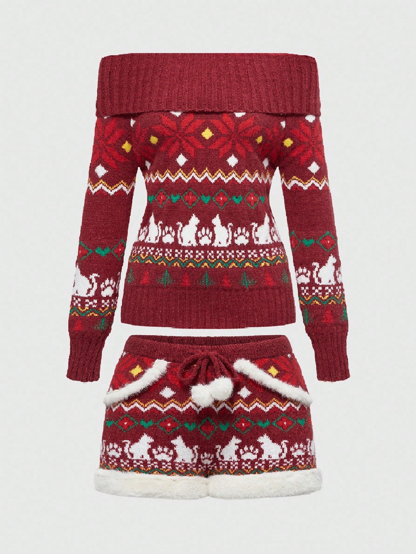 ROMWE Avant Ensemble 2 pièces pull à épaules dénudées à motif de flocons de neige Fair Isle et short en tricot pour femmes, automne/hiver