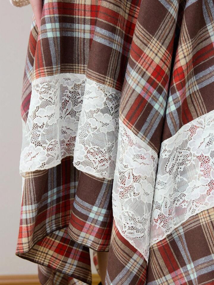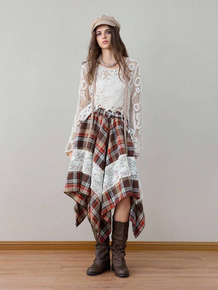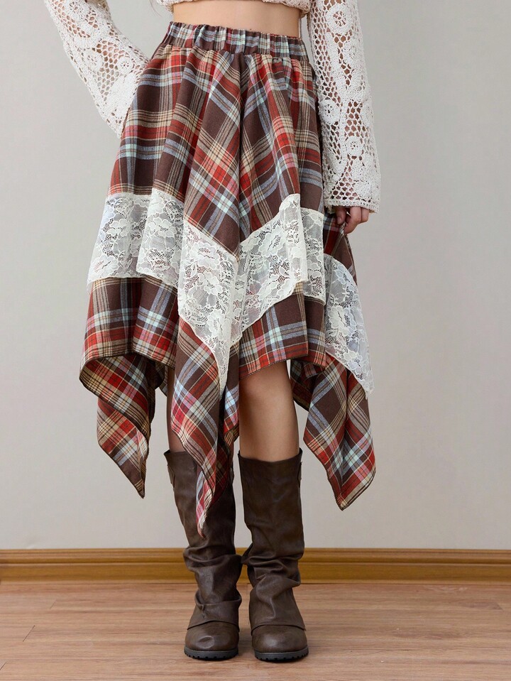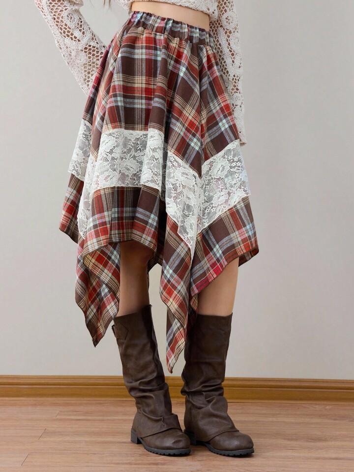 ROMWE Avant Jupe parapluie asymétrique en coton à carreaux et dentelle, style forestier