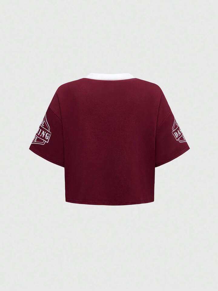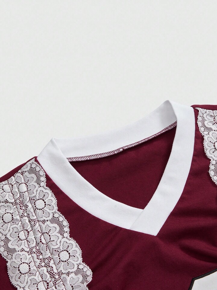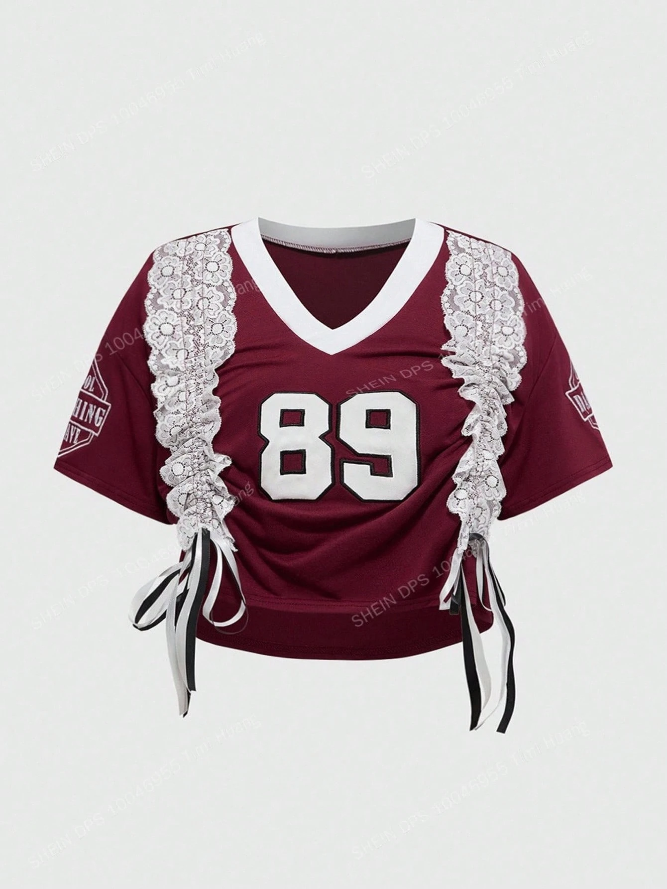 ROMWE Avant T-shirt court à col V avec broderie numérique, cordon de serrage et garniture en dentelle, style sportif rétro pour femmes