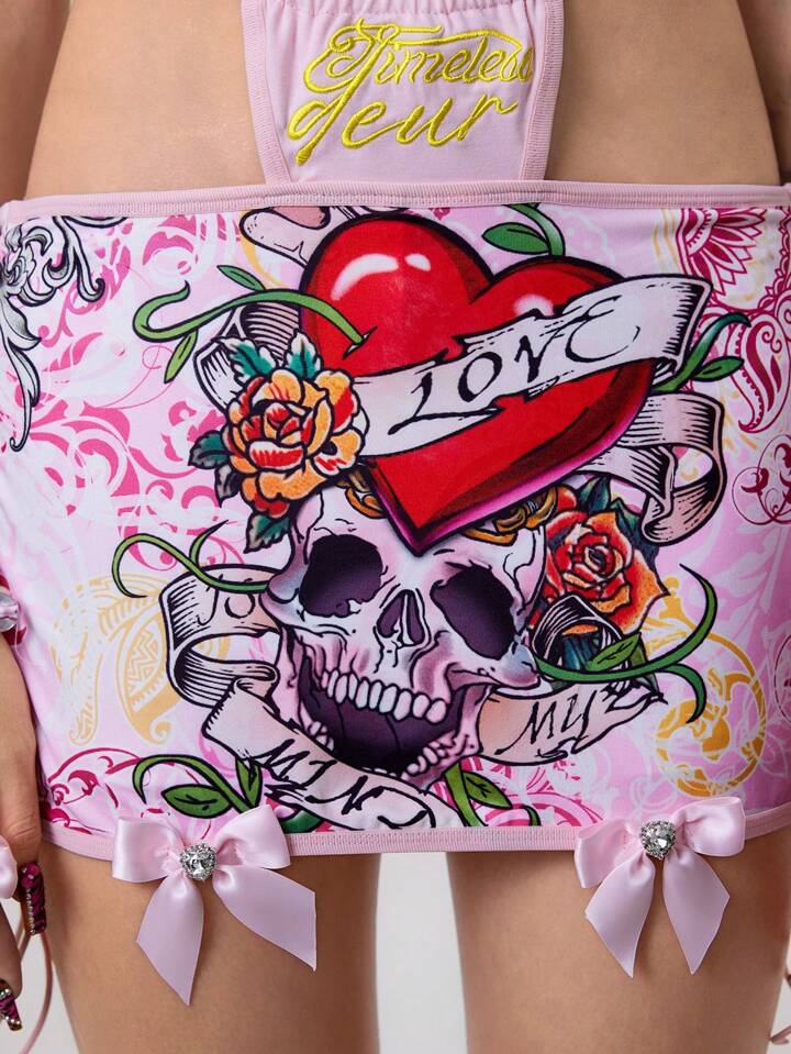 ROMWE Avant Ensemble 2 pièces femme : Top de bikini rétro Y2K Babe Punk + Jupe bandage imprimé crâne, Tenue de rave