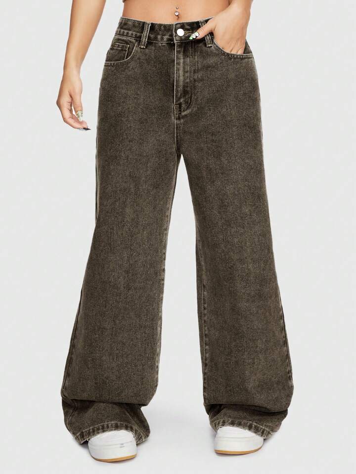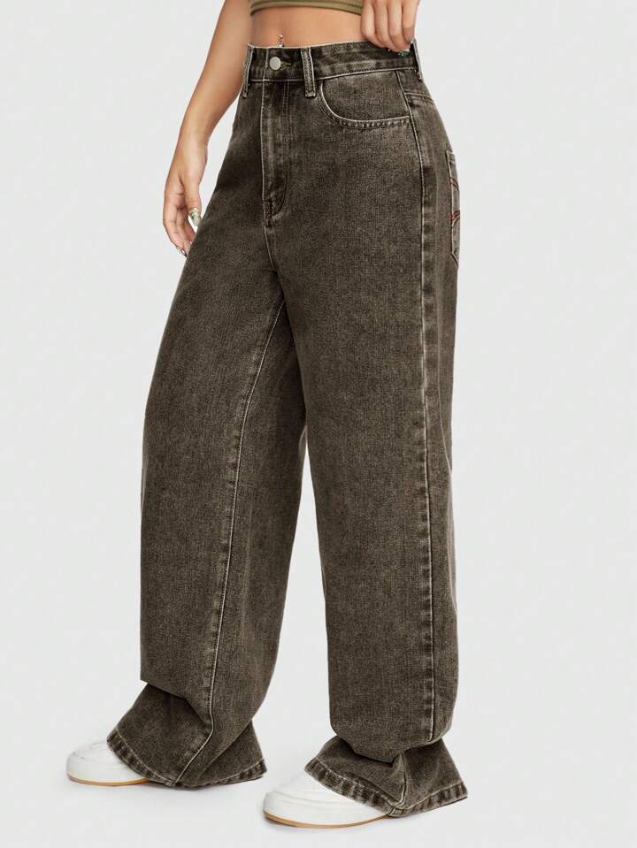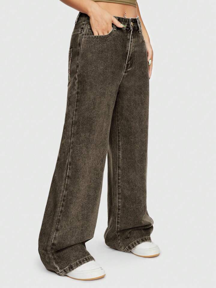ROMWE Avant Pantalon en jean brodé droit pour femmes de style street, de couleur unie et avec slogan linéaire de vigne, décontracté