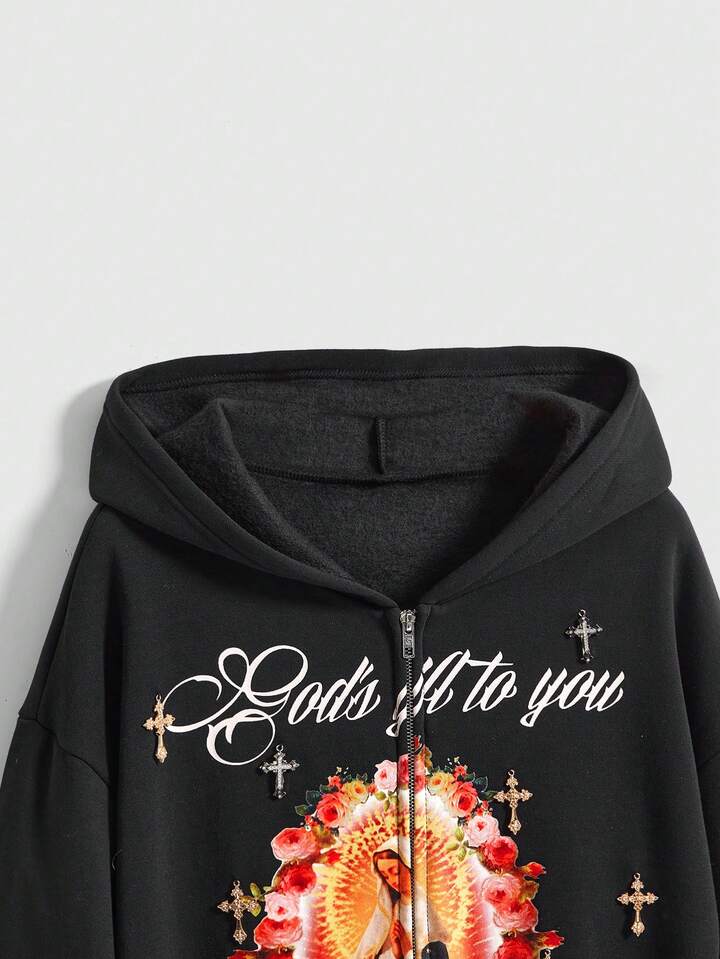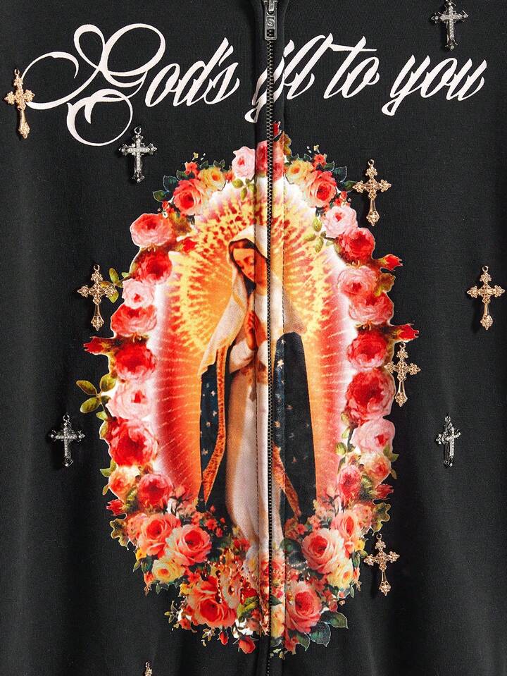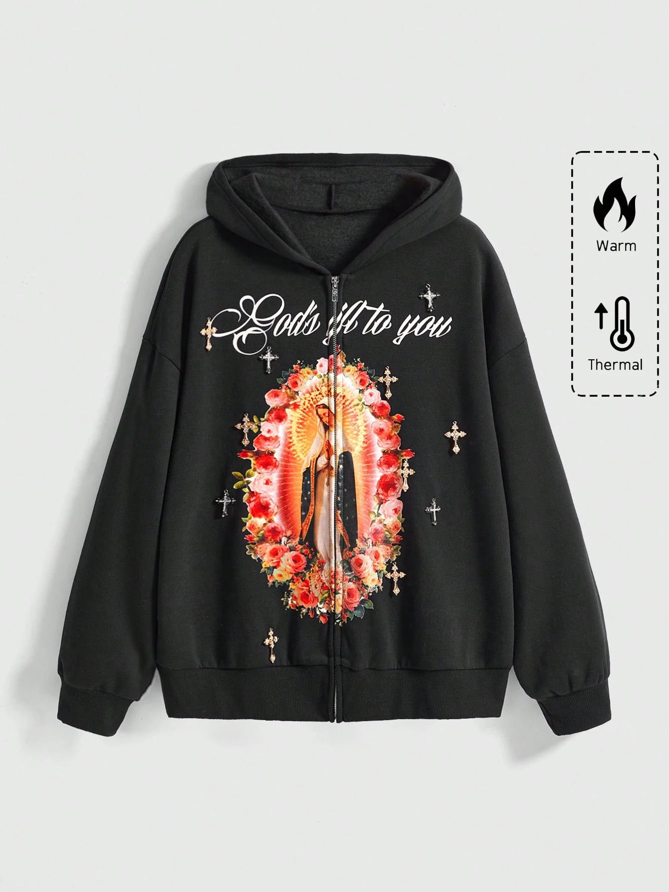 ROMWE Avant sweat-shirt à capuche zippé doublé thermique avec graphique Vierge Marie croix, style rétro Y2K baddie, unisexe