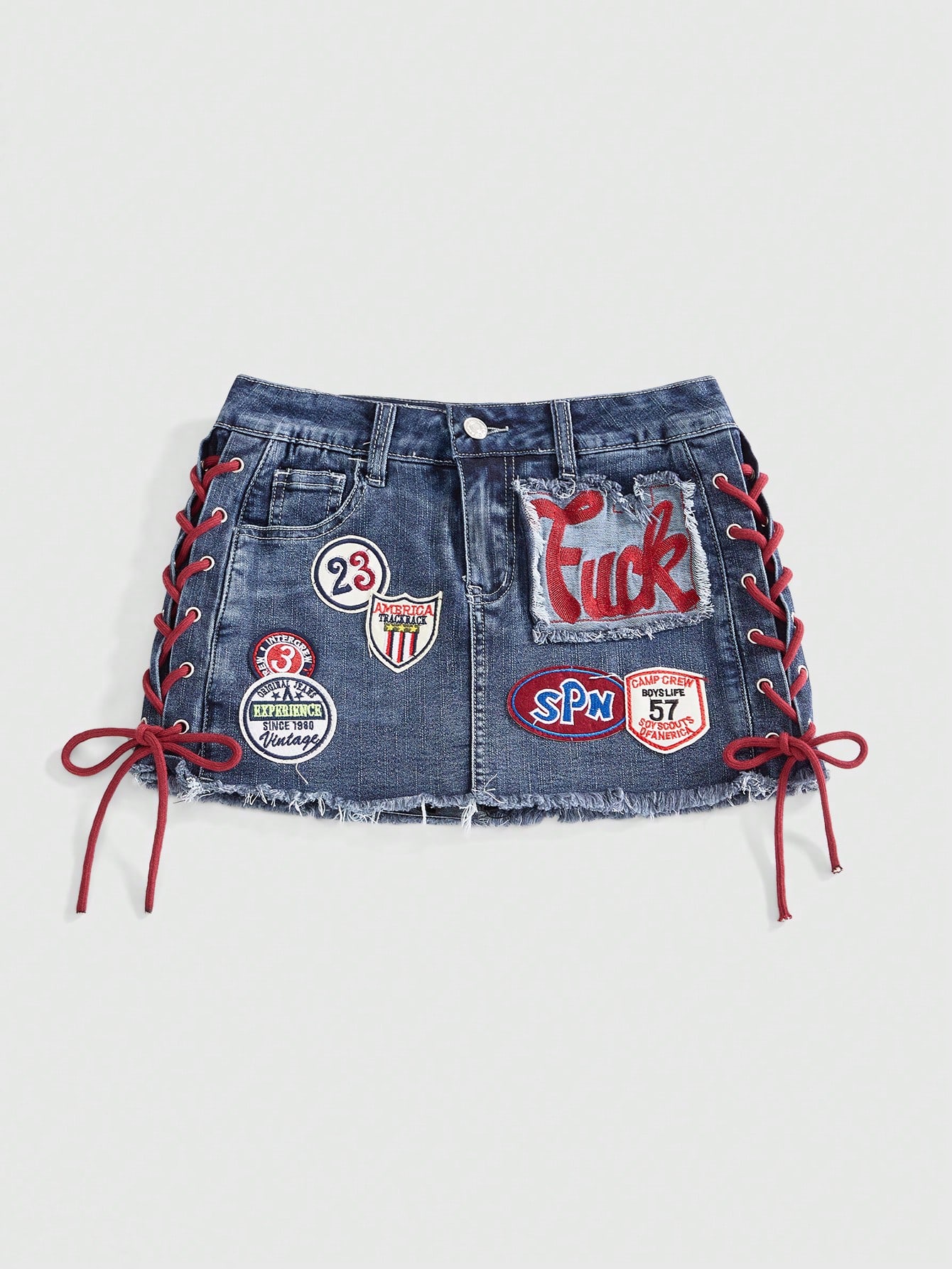 ROMWE Avant Jupe moulante en jean sexy à taille basse avec cordon de serrage, style graphique de logo brodé, style de ballet sportif rétro Y2K pour femmes