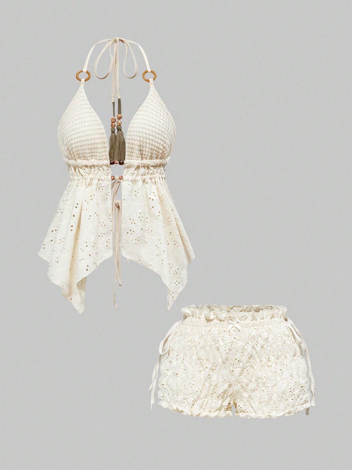 ROMWE Avant Ensemble 2 pièces style Y2K : top à fines bretelles sans dos avec décoration de perles en bois et short bouffant à taille basse pour femmes