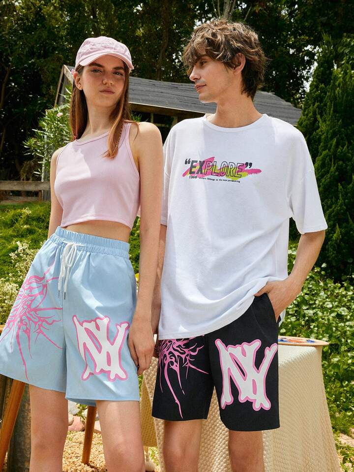 ROMWE UNISEX 1 pièce Short à cordon de serrage avec graphique de lettre, école