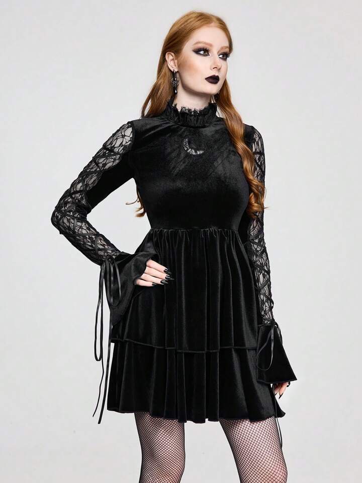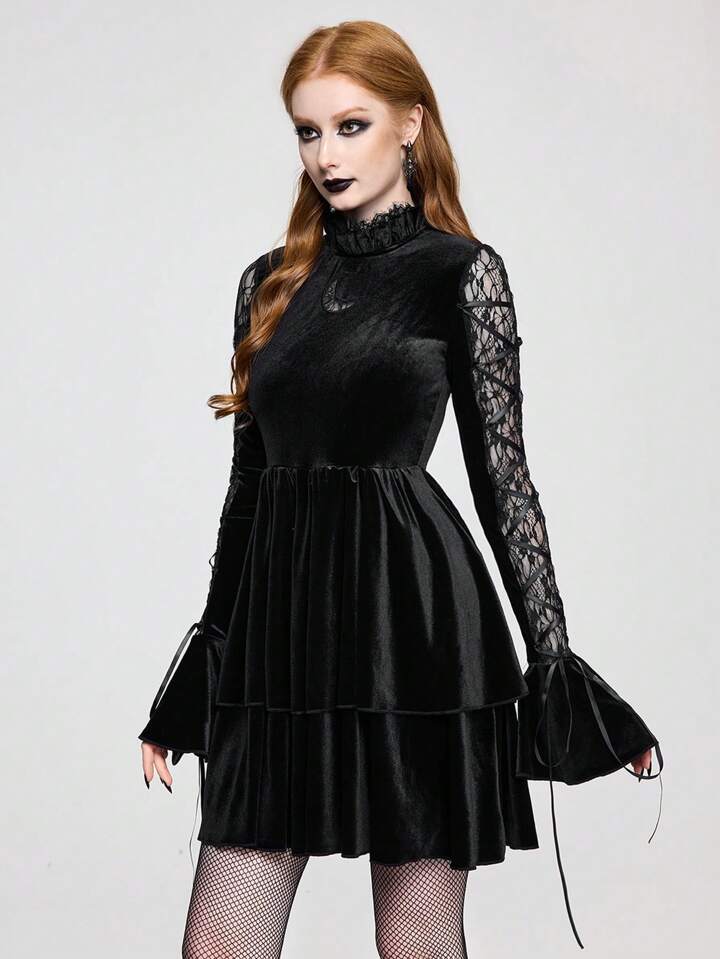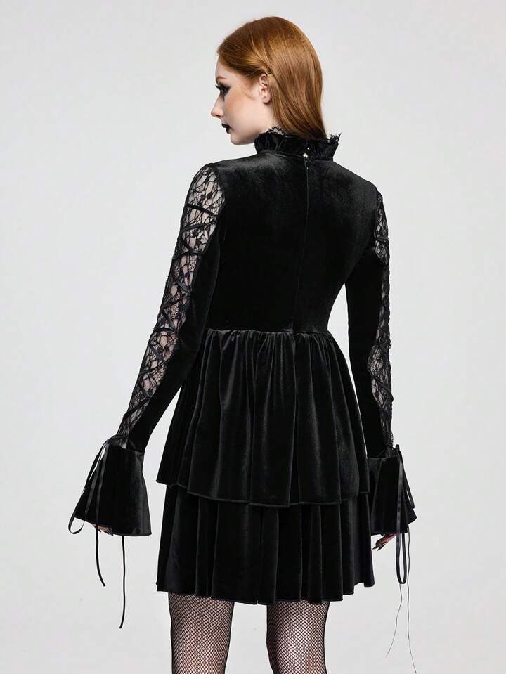 Robe patineuse en velours avec manches évasées, patchwork de dentelle gothique rétro et croisillons pour femmes