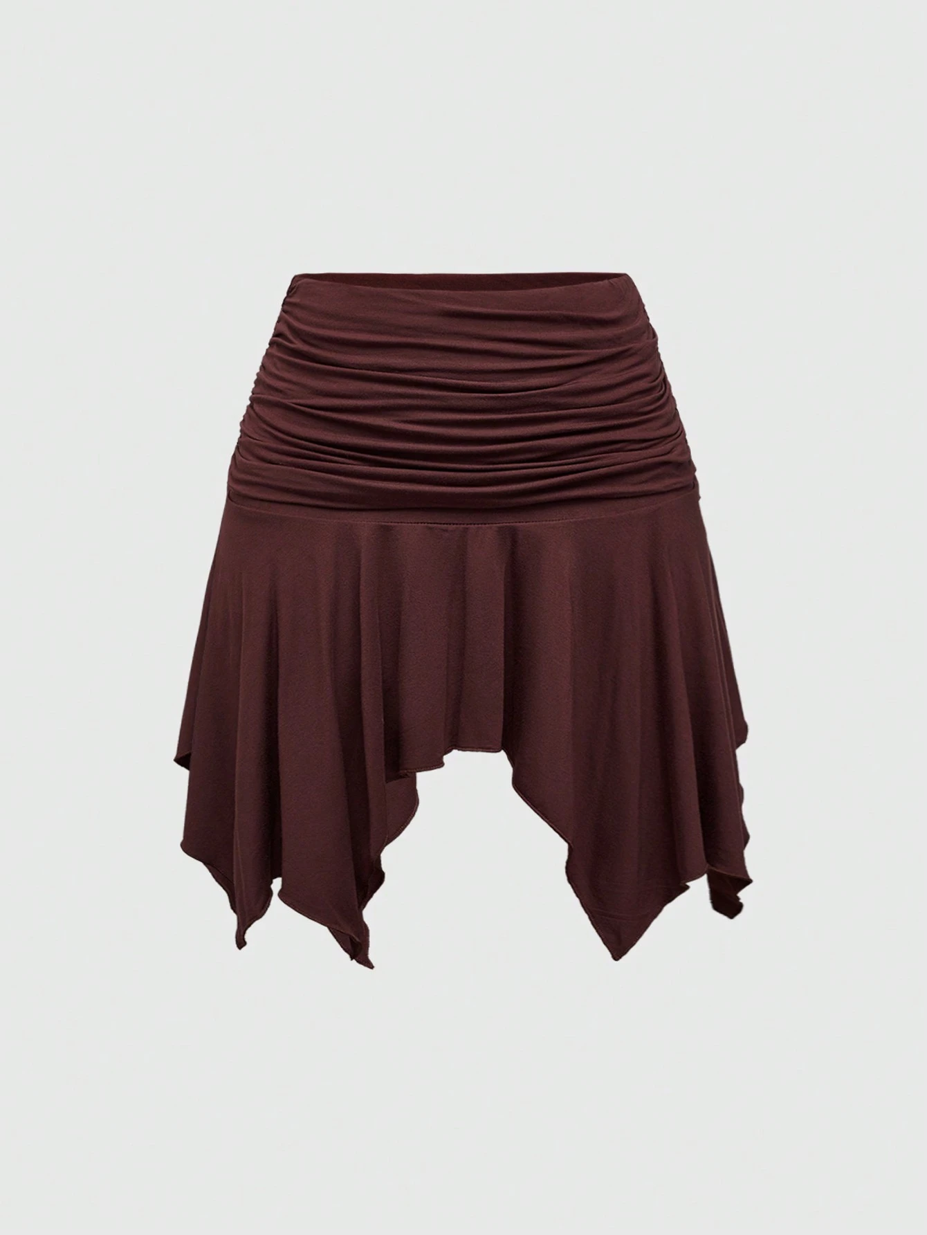 Jupe évasée asymétrique à taille froncée de style hippie rétro de couleur unie