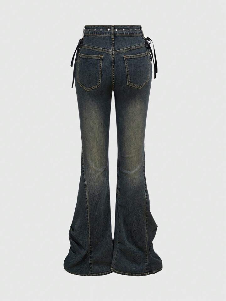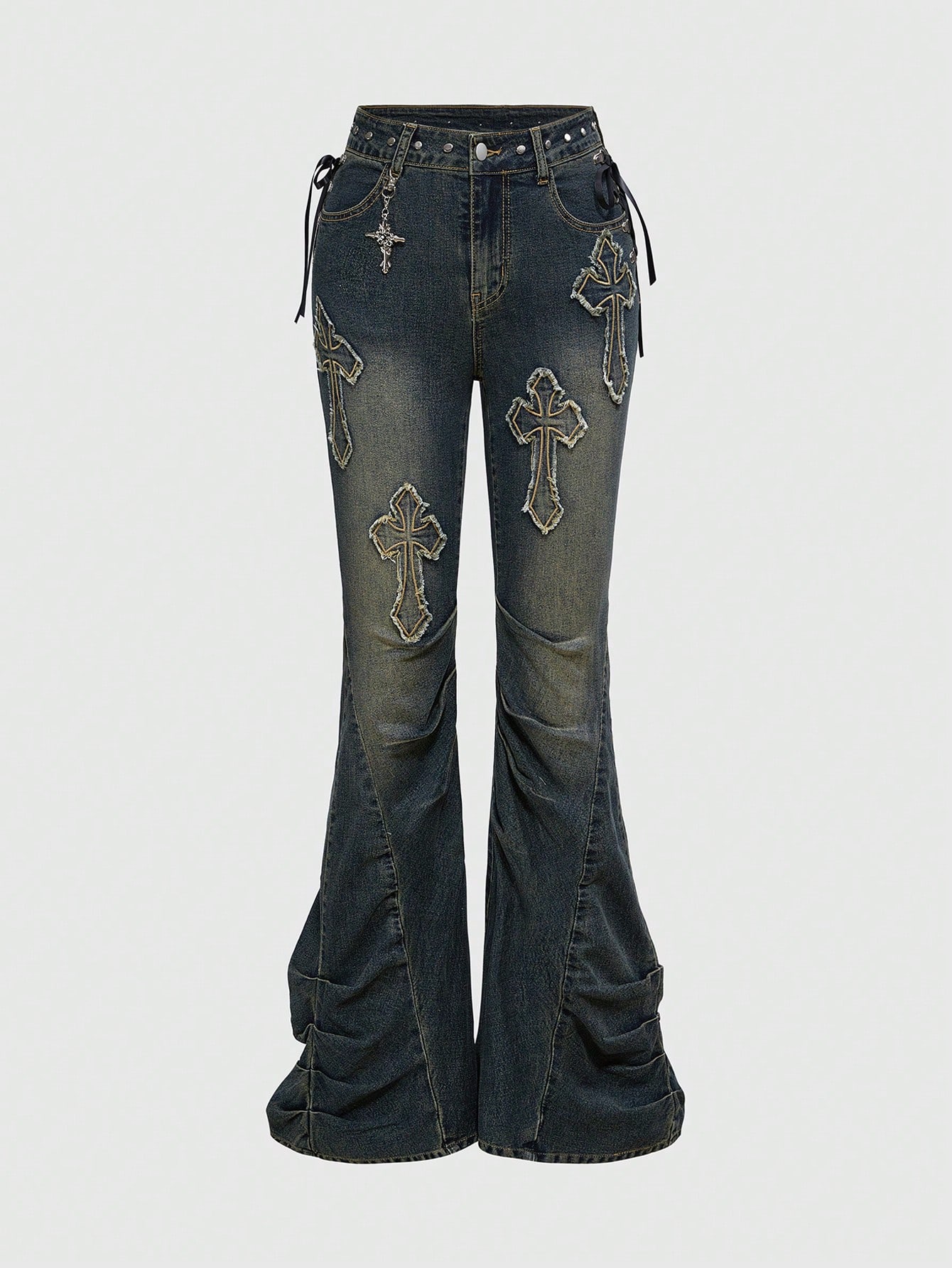Jean évasé à lacets sur les côtés, à patchwork de croix, style rétro vintage goth