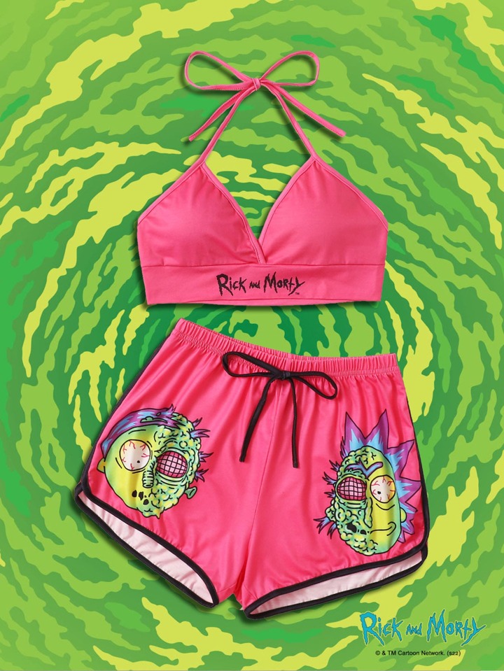 Rick and Morty | ROMWE Ensemble de pyjama rue lettre dessin animé à liseré contrastant à nœud