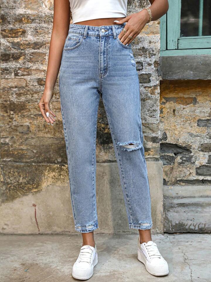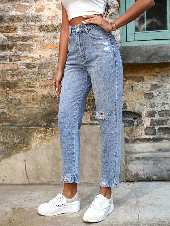 Jeans maman déchirés, effilochés, boutonnés, avec poches, déchirés et fermeture éclair. Coupe naturelle, effilée/carotte recoupée, lavage clair. Coupe régulière. Jeans maman en coton pour femmes, pour le printemps/automne, port casual quotidien