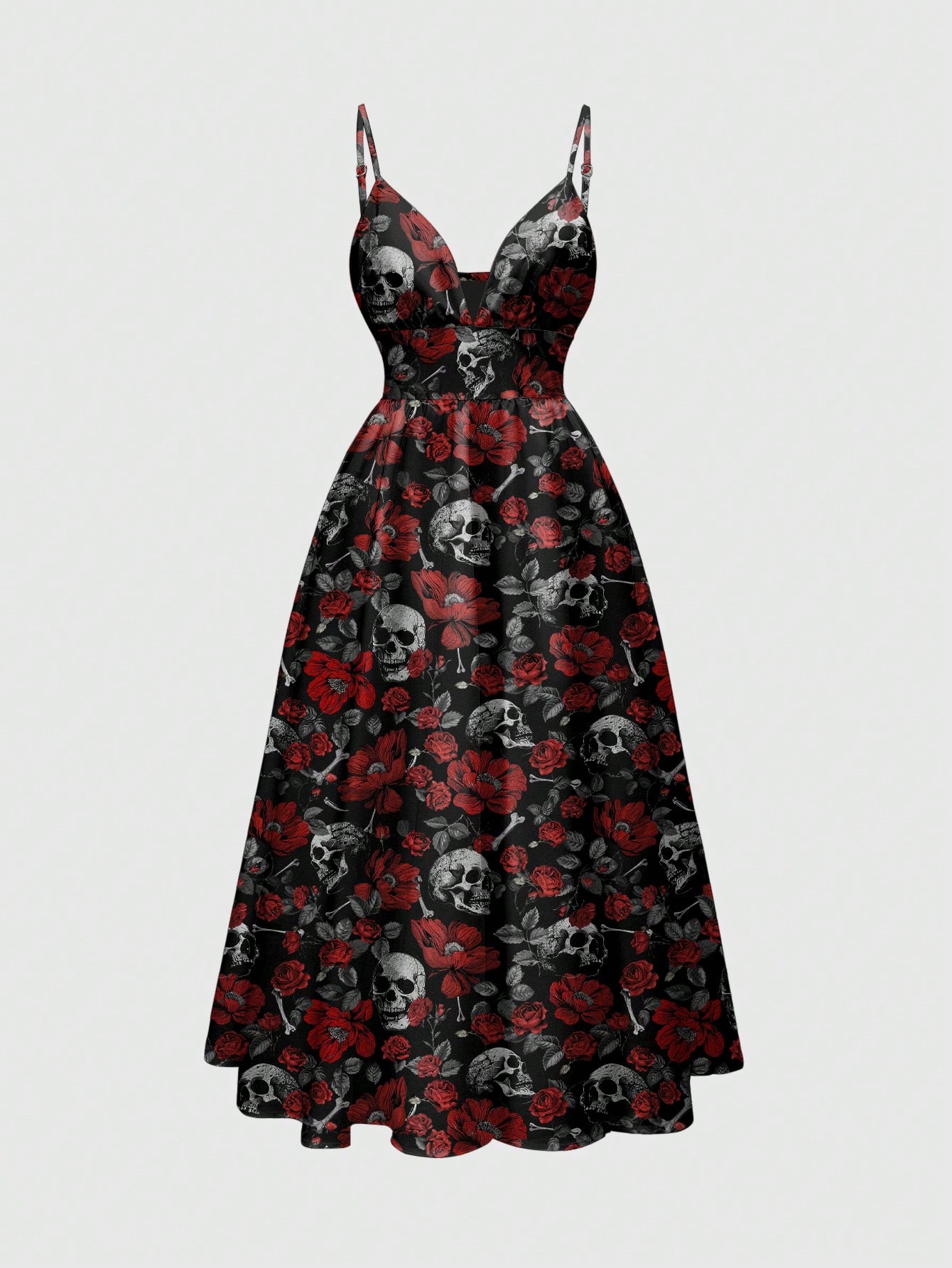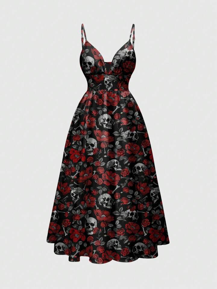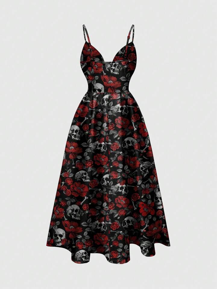Robe sexy pour femmes à bretelles fines, décolleté plongeant, style romantique et mystérieux, imprimé all-over, style gothique punk rose