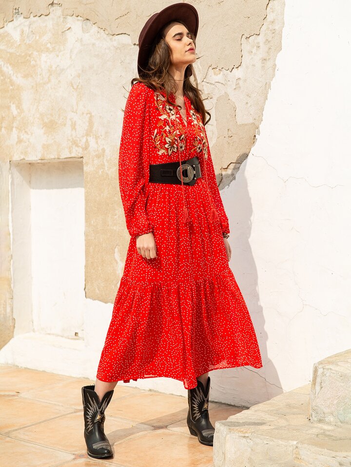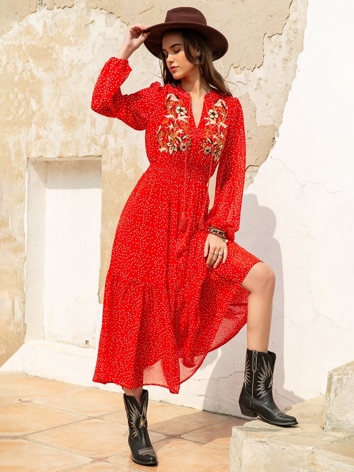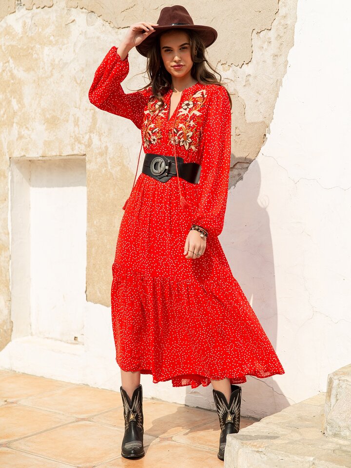 Rusttydustty Robe longue élégante pour femme en chiffon bohème noir à pois avec broderie, col V avec lien, pour plage, vacances et festivals de musique