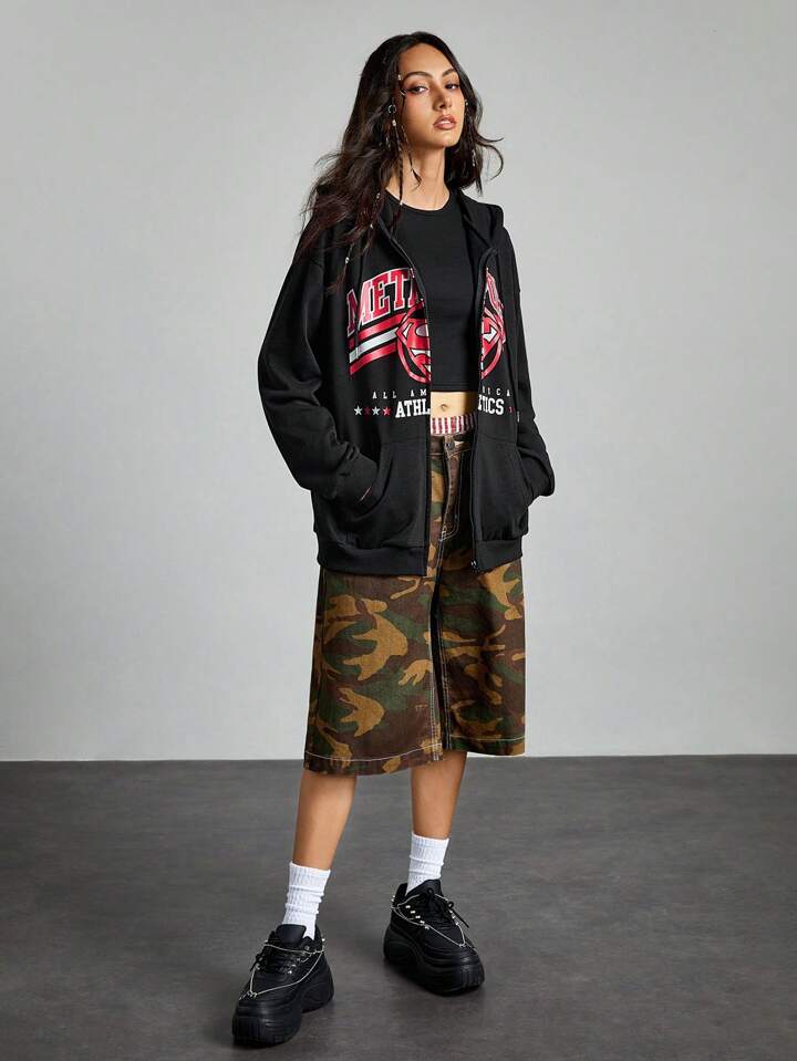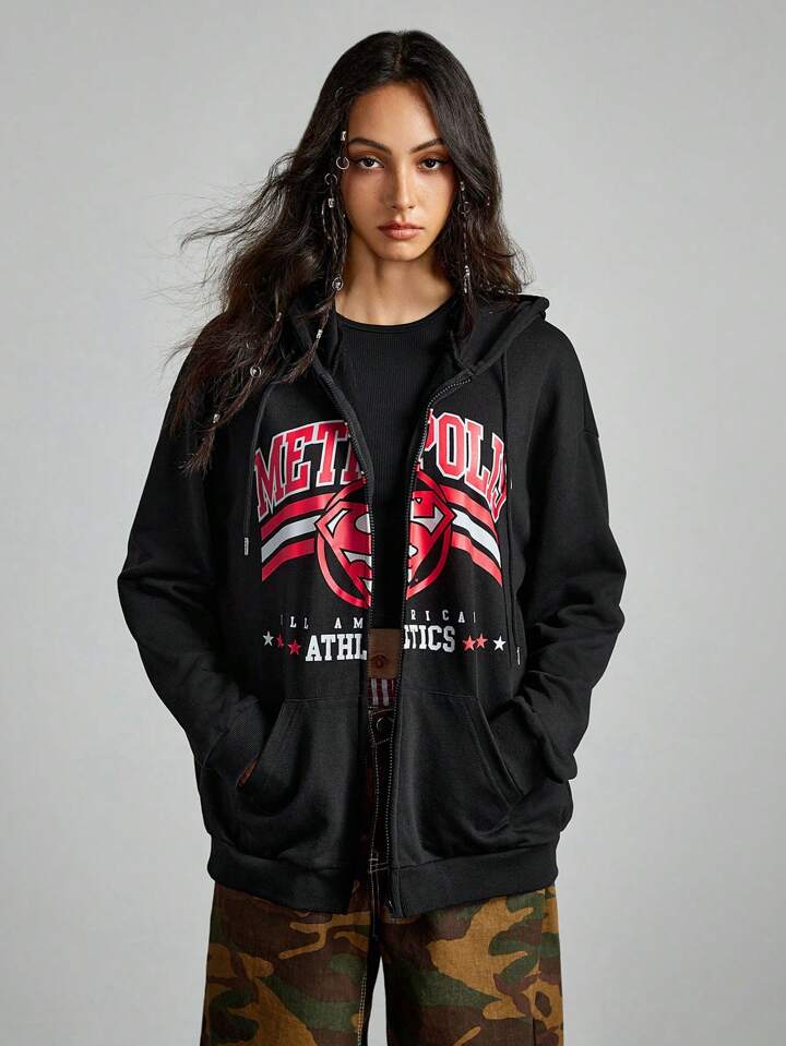 SUPERMAN X ROMWE Sweat-shirt ample à capuche zippé avec cordon de serrage, imprimé de lettres et de logo, pour femmes, printemps et automne