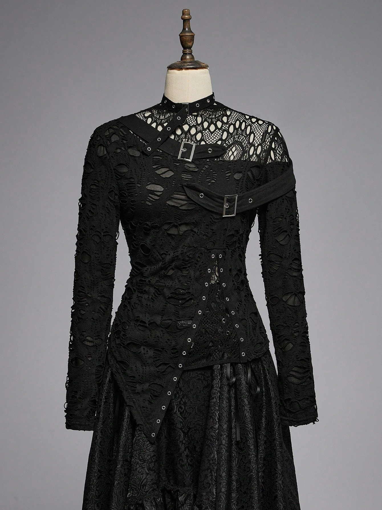 Top asymétrique style punk gothique avec patchwork de maille florale déchirée noire sexy