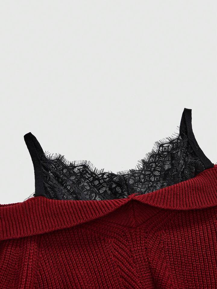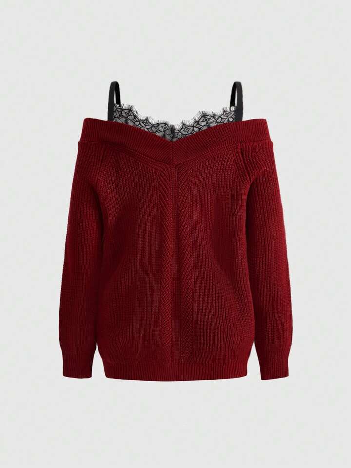 Élégant pull ample en tricot avec contraste de dentelle épaules dénudées pour femmes