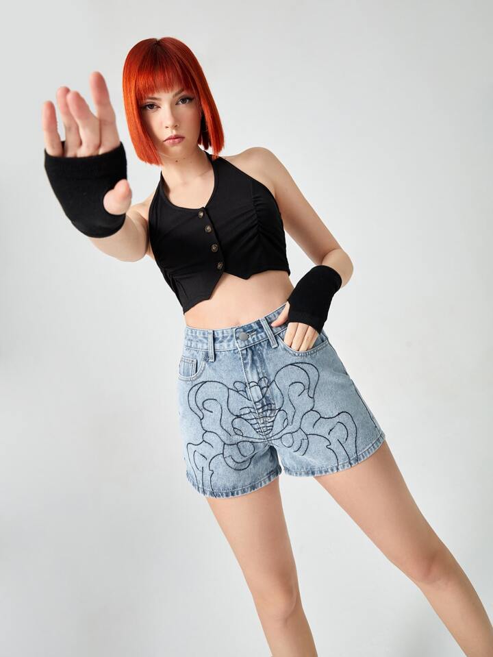 Short en jean à imprimé squelette