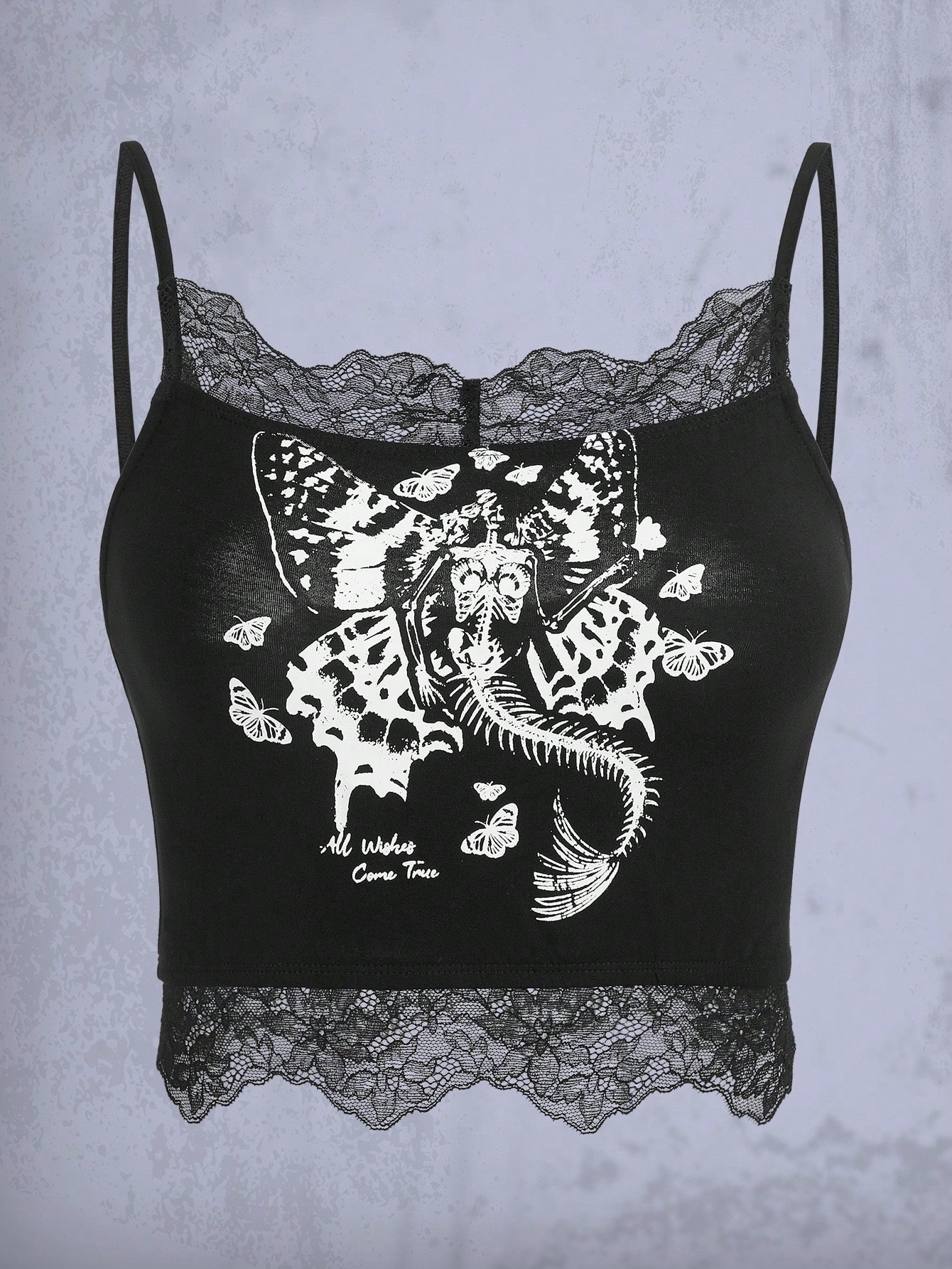 Top à fines brides tête de mort & à imprimé papillon ourlet en dentelle