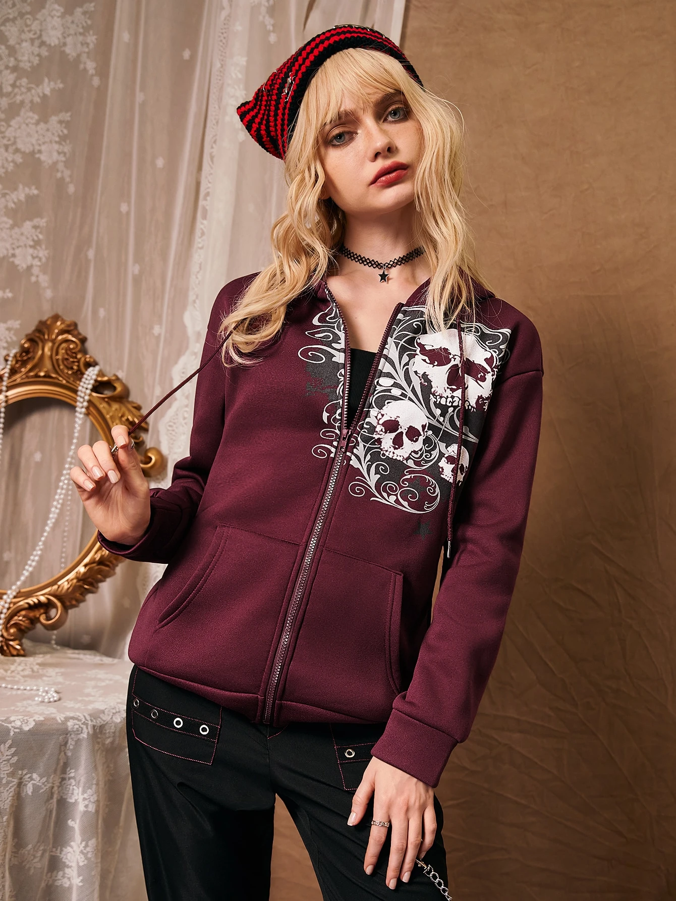 Sweat-shirt à capuche zippé à motif tête de mort