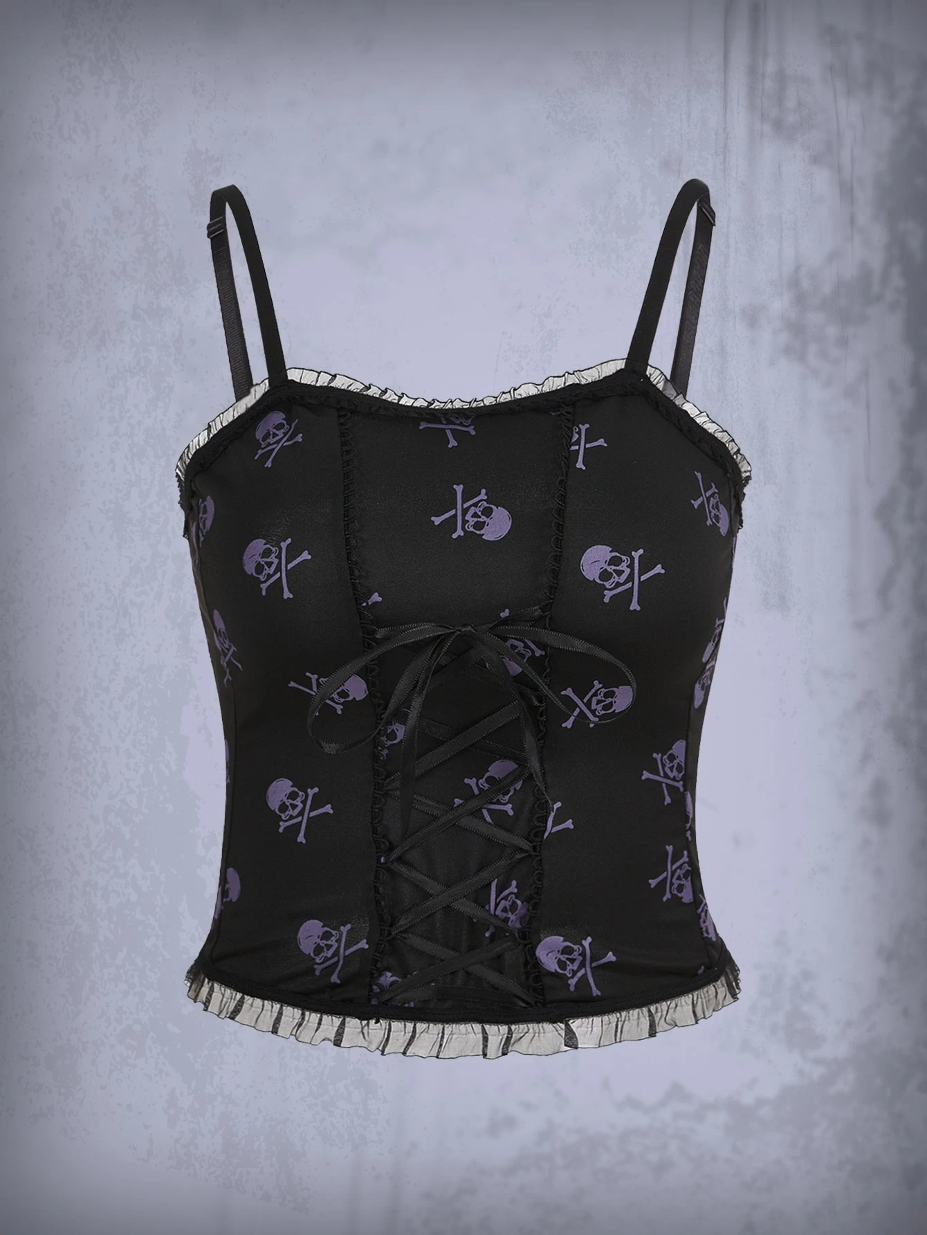 Top à fines brides à imprimé tête de mort à plis à lacets