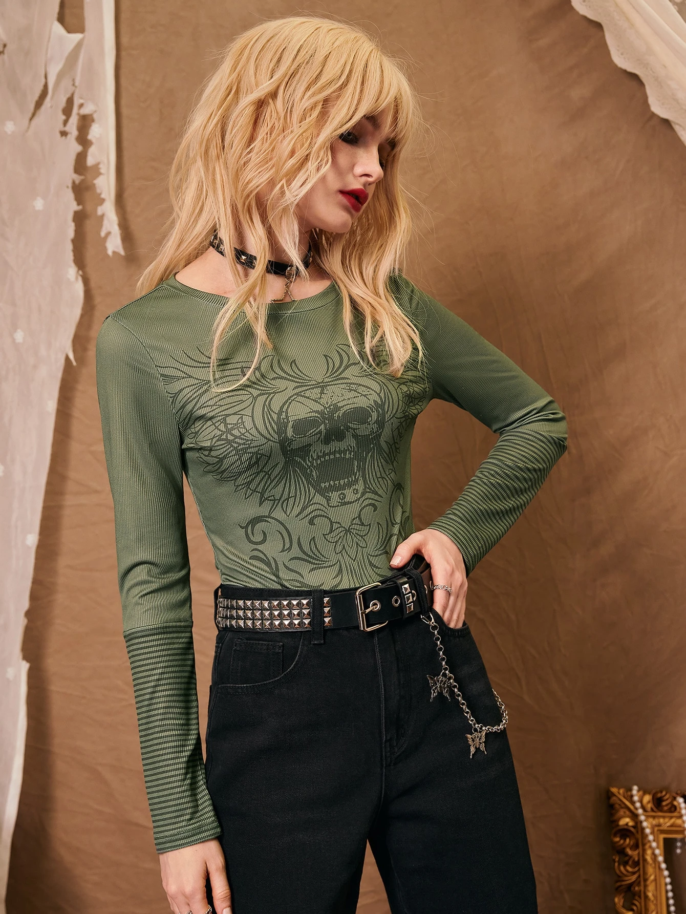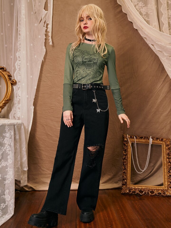 T-shirt à imprimé tête de mort à rayures