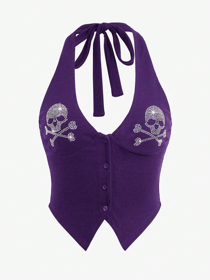 Top ras-du-cou tête de mort à strass dos-nu