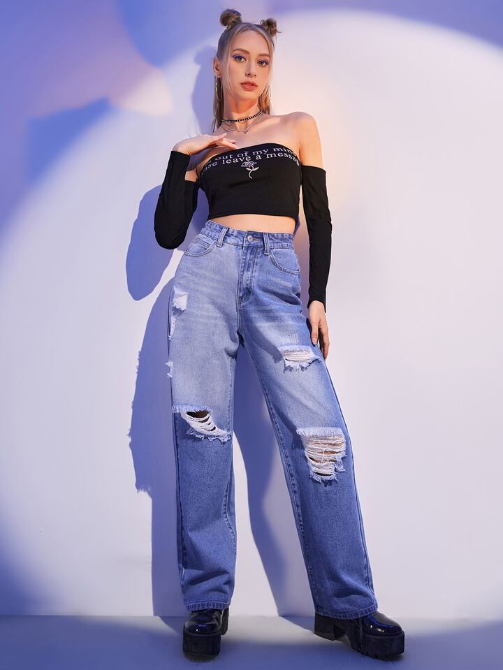 Top col bardot à motif slogan