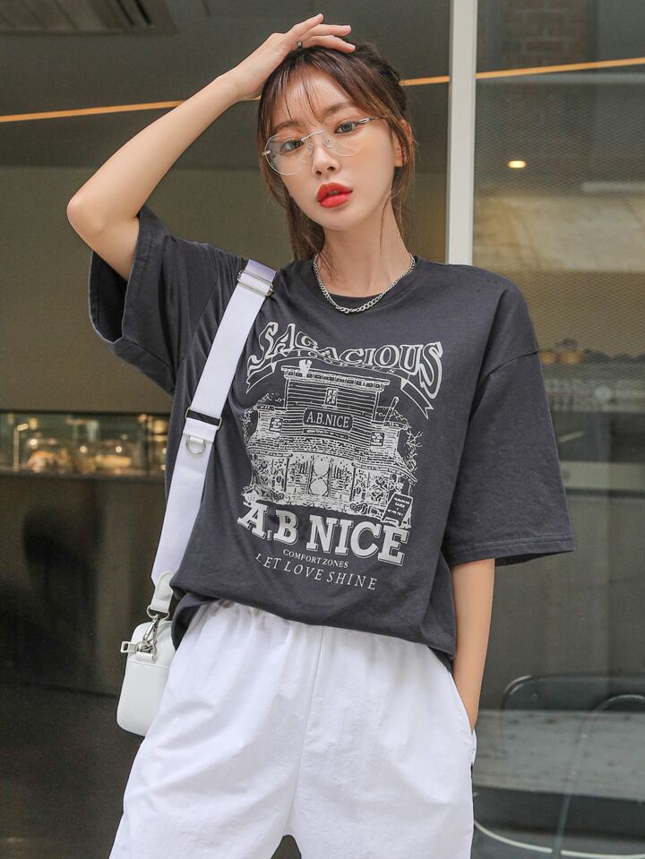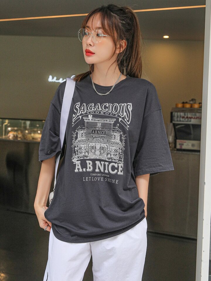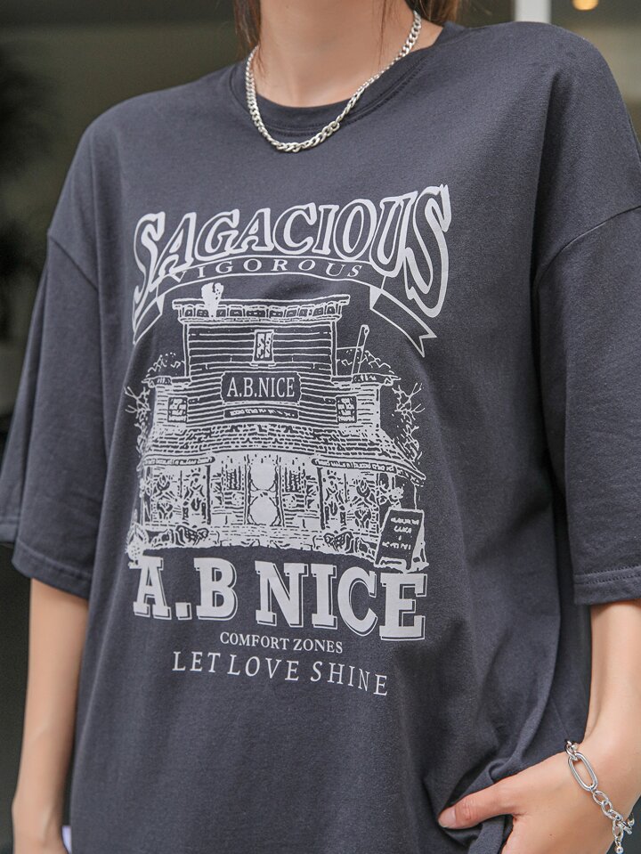 T-shirt À Épaules Tombantes Avec Impression De Slogan Et De Maison