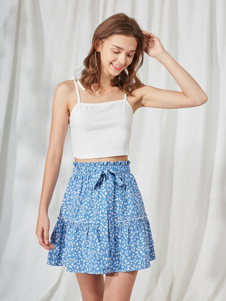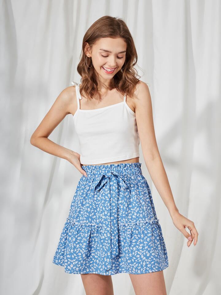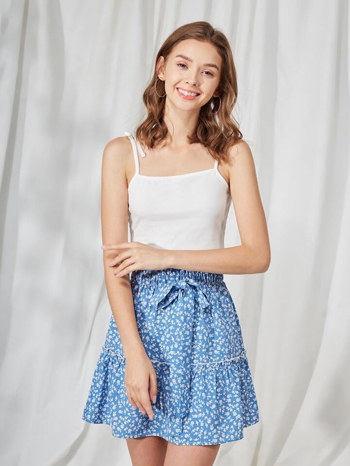 Ensemble jupe fleurie et top à fines brides unicolore avec nœud
