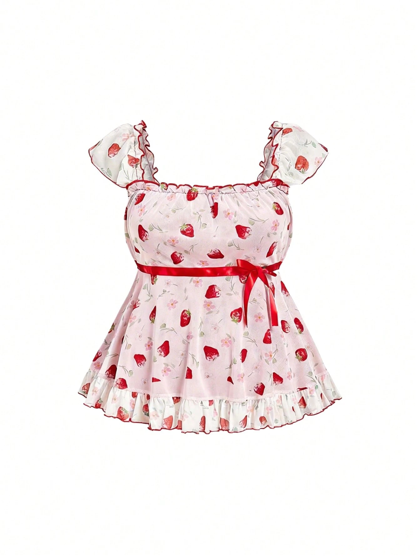 Kawaii Chemise "Poupée" imprimée fraise pour femmes grandes tailles, avec dentelle contrastée, ambiance vacances, convient pour le printemps/été