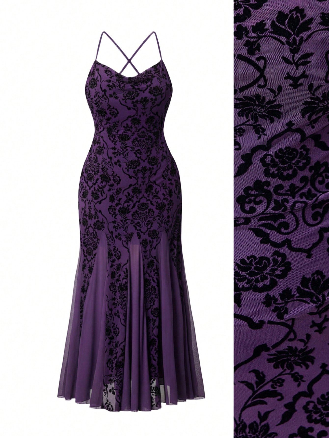 Robe vintage hippie élégante à encolure drapée en maille floquée pour femmes grandes tailles, violet foncé