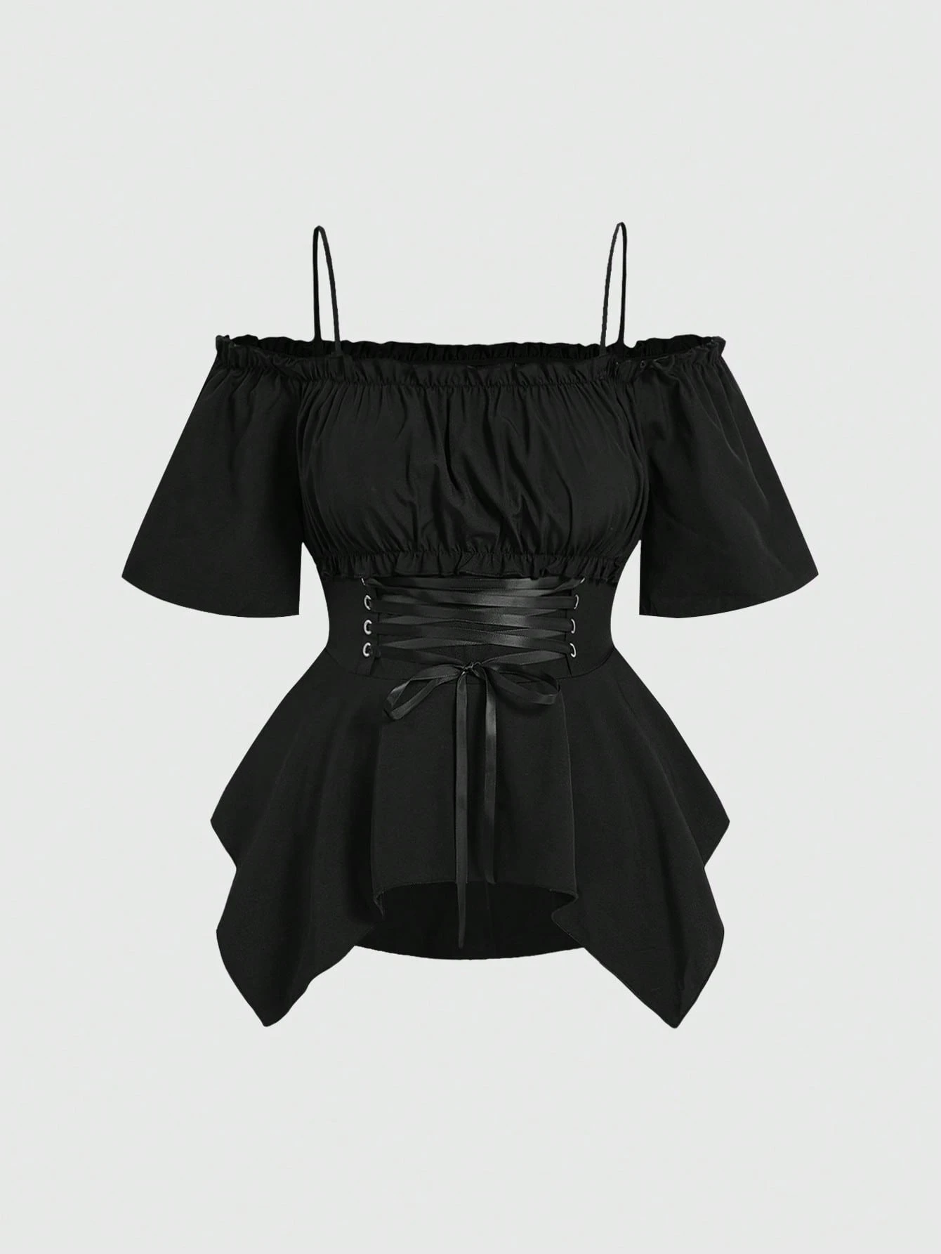 Top à manches courtes asymétrique avec volants à la taille et nœud pour femmes grandes tailles, style gothique