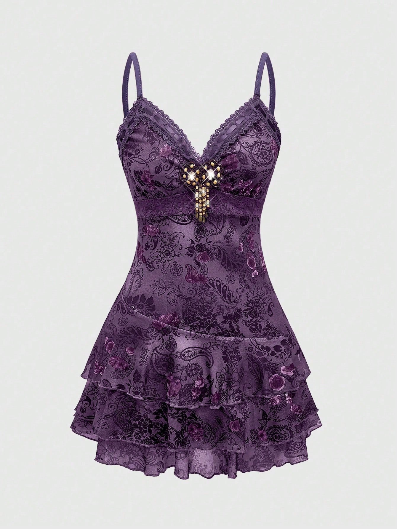 Robe mini femme à volants inspirée du style hippie vintage avec ruban, dentelle et imprimé cachemire