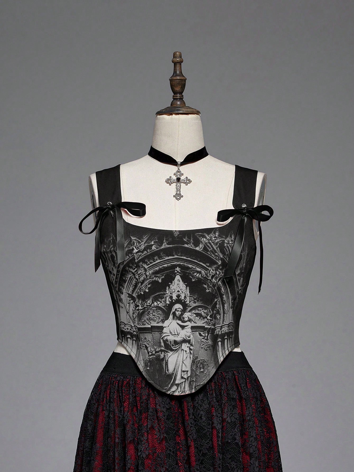 Camisole ajustée à lacets, style gothique médiéval, imprimé église et château, couleurs contrastées